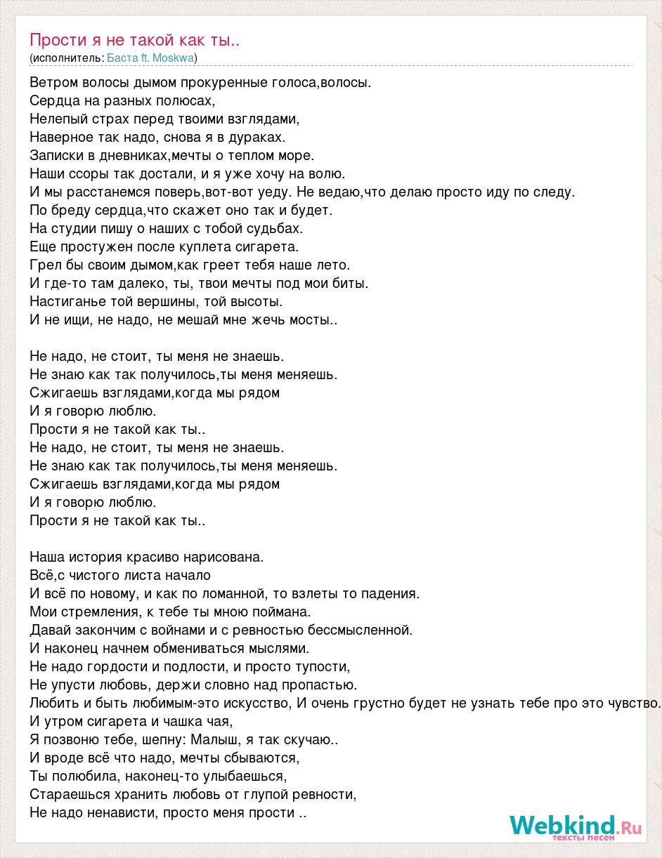 Ветром волосы дымом прокуренные голоса,волосы. Сердца на разных полюсах, Нелепый страх перед твоими взглядами, Наверное так надо, снова я в дураках. Записки в дневниках,мечты о теплом море. Наши ссоры так достали, и я уже хочу на волю. И мы расстанемся поверь,вот-вот уеду. Не ведаю,что делаю просто иду по следу. По бреду сердца,что скажет оно так и будет. На студии пишу о наших с тобой судьбах. Еще простужен после куплета сигарета. Грел бы своим дымом,как греет тебя наше лето. И где-то там далеко, ты, твои мечты под мои биты. Настиганье той вершины, той высоты. И не ищи, не надо, не мешай мне жечь мосты.. Не надо, не стоит, ты меня не знаешь. Не знаю как так получилось,ты меня меняешь. Сжигаешь взглядами,когда мы рядом И я говорю люблю. Прости я не такой как ты.. Не надо, не стоит, ты меня не знаешь. Не знаю как так получилось,ты меня меняешь. Сжигаешь взглядами,когда мы рядом И я говорю люблю. Прости я не такой как ты.. Наша история красиво нарисована. Всё,с чистого листа начало И всё по новому, и как по ломанной, то взлеты то падения. Мои стремления, к тебе ты мною поймана. Давай закончим с войнами и с ревностью бессмысленной. И наконец начнем обмениваться мыслями. Не надо гордости и подлости, и просто тупости, Не упусти любовь, держи словно над пропастью. Любить и быть любимым-это искусство, И очень грустно будет не узнать тебе про это чувство. И утром сигарета и чашка чая, Я позвоню тебе, шепну: Малыш, я так скучаю.. И вроде всё что надо, мечты сбываются, Ты полюбила, наконец-то улыбаешься, Стараешься хранить любовь от глупой ревности, Не надо ненависти, просто меня прости ..