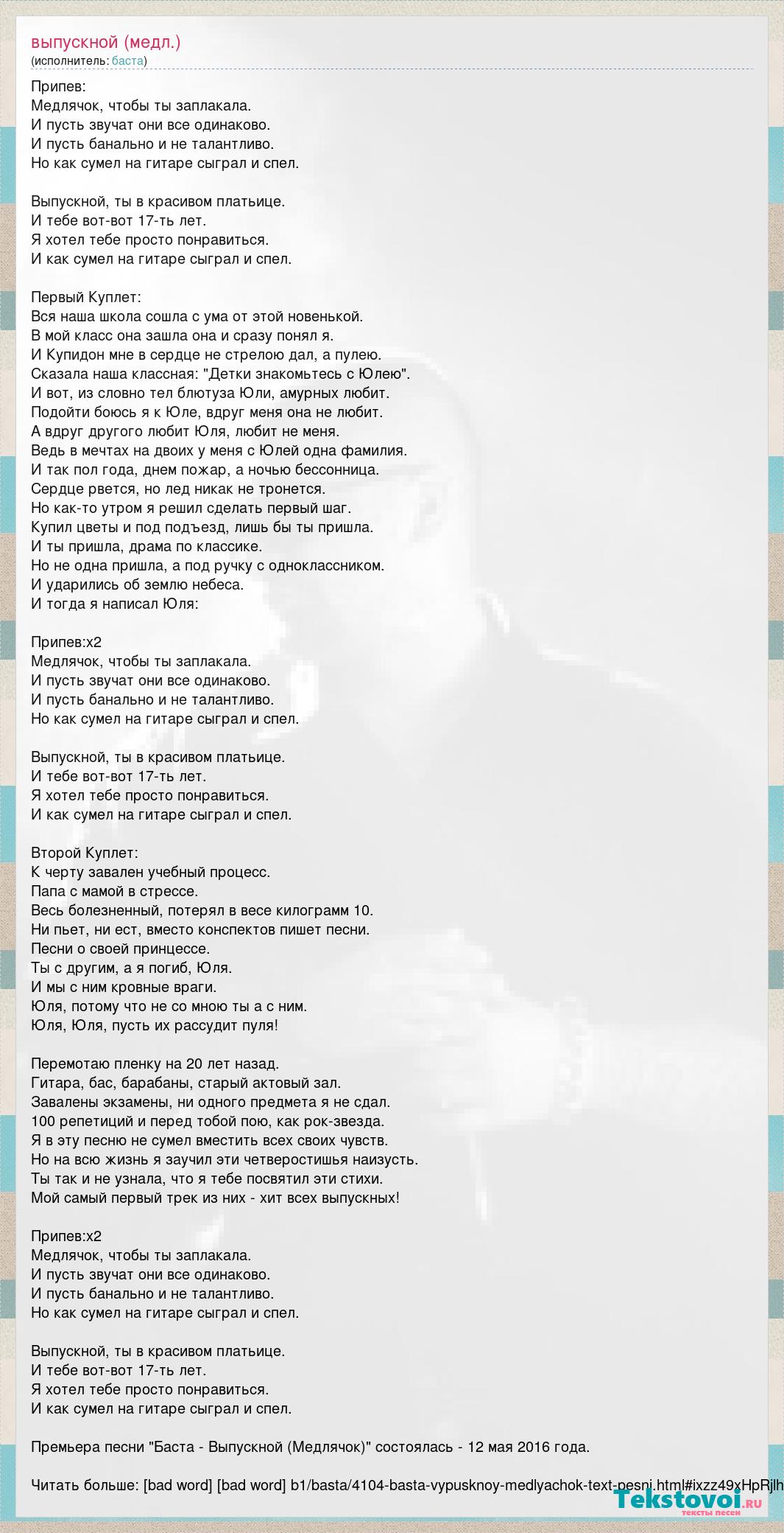 Припев: Медлячок, чтобы ты заплакала. И пусть звучат они все одинаково. И пусть банально и не талантливо. Но как сумел на гитаре сыграл и спел. Выпускной, ты в красивом платьице. И тебе вот-вот 17-ть лет. Я хотел тебе просто понравиться. И как сумел на гитаре сыграл и спел. Первый Куплет: Вся наша школа сошла с ума от этой новенькой. В мой класс она зашла она и сразу понял я. И Купидон мне в сердце не стрелою дал, а пулею. Сказала наша классная: "Детки знакомьтесь с Юлею". И вот, из словно тел блютуза Юли, амурных любит. Подойти боюсь я к Юле, вдруг меня она не любит. А вдруг другого любит Юля, любит не меня. Ведь в мечтах на двоих у меня с Юлей одна фамилия. И так пол года, днем пожар, а ночью бессонница. Сердце рвется, но лед никак не тронется. Но как-то утром я решил сделать первый шаг. Купил цветы и под подъезд, лишь бы ты пришла. И ты пришла, драма по классике. Но не одна пришла, а под ручку с одноклассником. И ударились об землю небеса. И тогда я написал Юля: Припев:х2 Медлячок, чтобы ты заплакала. И пусть звучат они все одинаково. И пусть банально и не талантливо. Но как сумел на гитаре сыграл и спел. Выпускной, ты в красивом платьице. И тебе вот-вот 17-ть лет. Я хотел тебе просто понравиться. И как сумел на гитаре сыграл и спел. Второй Куплет: К черту завален учебный процесс. Папа с мамой в стрессе. Весь болезненный, потерял в весе килограмм 10. Ни пьет, ни ест, вместо конспектов пишет песни. Песни о своей принцессе. Ты с другим, а я погиб, Юля. И мы с ним кровные враги. Юля, потому что не со мною ты а с ним. Юля, Юля, пусть их рассудит пуля! Перемотаю пленку на 20 лет назад. Гитара, бас, барабаны, старый актовый зал. Завалены экзамены, ни одного предмета я не сдал. 100 репетиций и перед тобой пою, как рок-звезда. Я в эту песню не сумел вместить всех своих чувств. Но на всю жизнь я заучил эти четверостишья наизусть. Ты так и не узнала, что я тебе посвятил эти стихи. Мой самый первый трек из них - хит всех выпускных! Припев:х2 Медлячок, чтобы ты заплакала. И пусть звучат они все одинаково. И пусть банально и не талантливо. Но как сумел на гитаре сыграл и спел. Выпускной, ты в красивом платьице. И тебе вот-вот 17-ть лет. Я хотел тебе просто понравиться. И как сумел на гитаре сыграл и спел. Премьера песни "Баста - Выпускной (Медлячок)" состоялась - 12 мая 2016 года. Читать больше: [bad word] [bad word] b1/basta/4104-basta-vypusknoy-medlyachok-text-pesni.html#ixzz49xHpRjlh