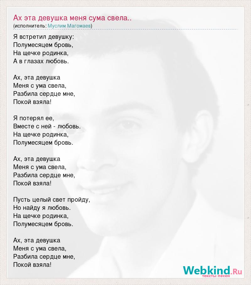 Я встретил девушку: Полумесяцем бровь, На щечке родинка, А в глазах любовь. Ах, эта девушка Меня с ума свела, Разбила сердце мне, Покой взяла! Я потерял ее, Вместе с ней - любовь. На щечке родинка, Полумесяцем бровь. Ах, эта девушка Меня с ума свела, Разбила сердце мне, Покой взяла! Пусть целый свет пройду, Но найду я любовь. На щечке родинка, Полумесяцем бровь. Ах, эта девушка Меня с ума свела, Разбила сердце мне, Покой взяла!