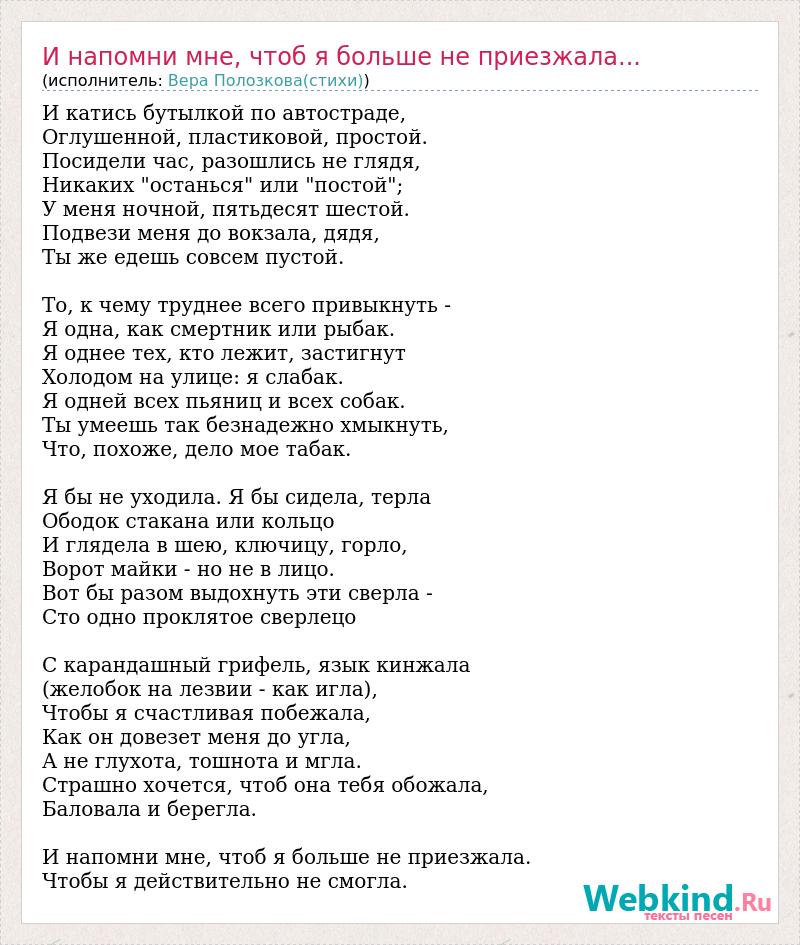 А как ты думаешь, о чем песня "И напомни мне, чтоб я больше не приезжала..." ?