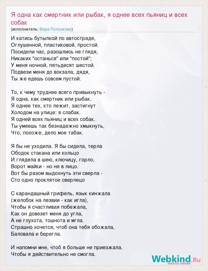 Я одна как смертник или рыбак, я однее всех пьяниц и всех собак