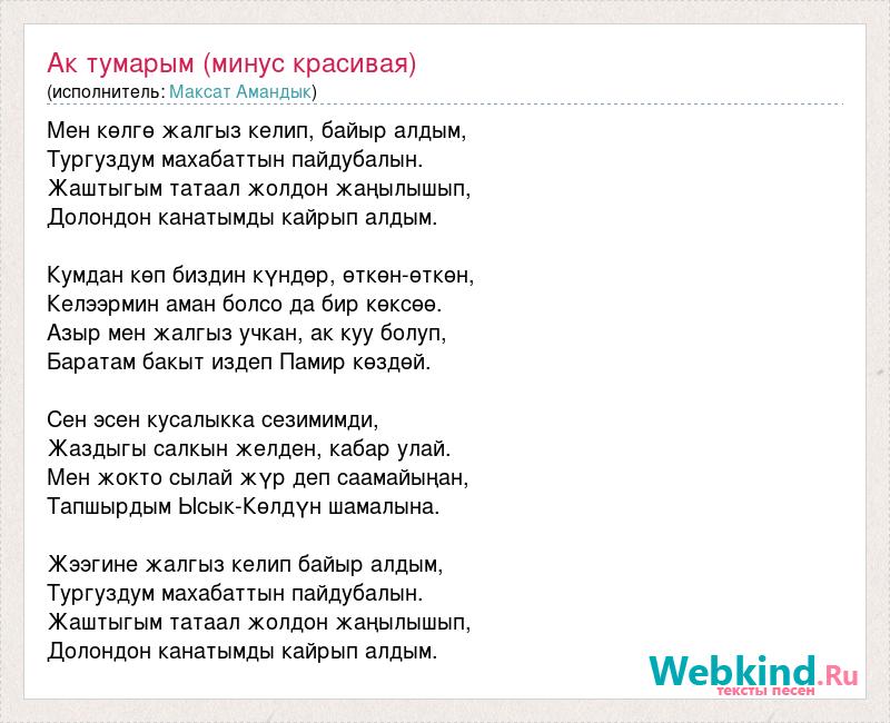 Мен көлгө жалгыз келип, байыр алдым, Тургуздум махабаттын пайдубалын. Жаштыгым татаал жолдон жаңылышып, Долондон канатымды кайрып алдым. Кумдан көп биздин күндөр, өткөн-өткөн, Келээрмин аман болсо да бир көксөө. Азыр мен жалгыз учкан, ак куу болуп, Баратам бакыт издеп Памир көздөй. Сен эсен кусалыкка сезимимди, Жаздыгы салкын желден, кабар улай. Мен жокто сылай жүр деп саамайыңан, Тапшырдым Ысык-Көлдүн шамалына. Жээгине жалгыз келип байыр алдым, Тургуздум махабаттын пайдубалын. Жаштыгым татаал жолдон жаңылышып, Долондон канатымды кайрып алдым.