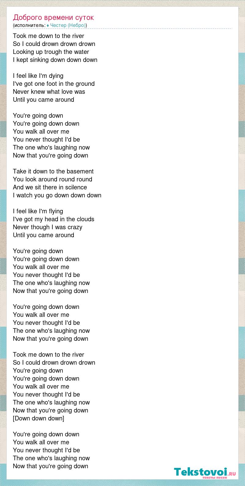 Took me down to the river So I could drown drown drown Looking up trough the water I kept sinking down down down I feel like I'm dying I've got one foot in the ground Never knew what love was Until you came around You're going down You're going down down You walk all over me You never thought I'd be The one who's laughing now Now that you're going down Take it down to the basement You look around round round And we sit there in scilence I watch you go down down down I feel like I'm flying I've got my head in the clouds Never though I was crazy Until you came around You're going down You're going down down You walk all over me You never thought I'd be The one who's laughing now Now that you're going down You're going down down You walk all over me You never thought I'd be The one who's laughing now Now that you're going down Took me down to the river So I could drown drown drown You're going down You're going down down You walk all over me You never thought I'd be The one who's laughing now Now that you're going down [Down down down] You're going down down You walk all over me You never thought I'd be The one who's laughing now Now that you're going down