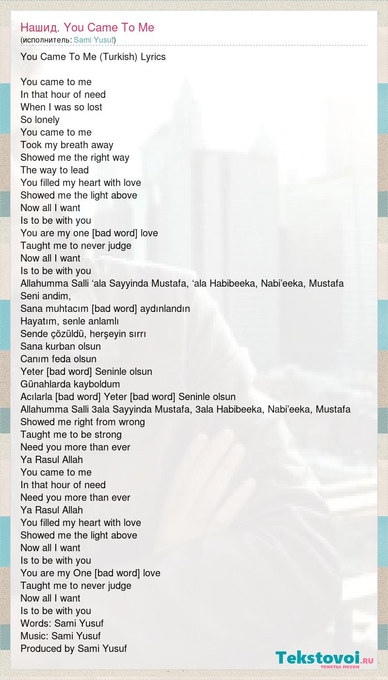 You Came To Me (Turkish) Lyrics You came to me In that hour of need When I was so lost So lonely You came to me Took my breath away Showed me the right way The way to lead You filled my heart with love Showed me the light above Now all I want Is to be with you You are my one true love Taught me to never judge Now all I want Is to be with you Allahumma Salli ‘ala Sayyinda Mustafa, ‘ala Habibeeka, Nabi’eeka, Mustafa Seni andim, Sana muhtacım Nurunla aydınlandın Hayatım, senle anlamlı Sende çözüldü, herşeyin sırrı Sana kurban olsun Canım feda olsun Yeter ki ruhum Seninle olsun Günahlarda kayboldum Acılarla yoğruldum Yeter artık ruhum Seninle olsun Allahumma Salli 3ala Sayyinda Mustafa, 3ala Habibeeka, Nabi’eeka, Mustafa Showed me right from wrong Taught me to be strong Need you more than ever Ya Rasul Allah You came to me In that hour of need Need you more than ever Ya Rasul Allah You filled my heart with love Showed me the light above Now all I want Is to be with you You are my One True love Taught me to never judge Now all I want Is to be with you Words: Sami Yusuf Music: Sami Yusuf Produced by Sami Yusuf
