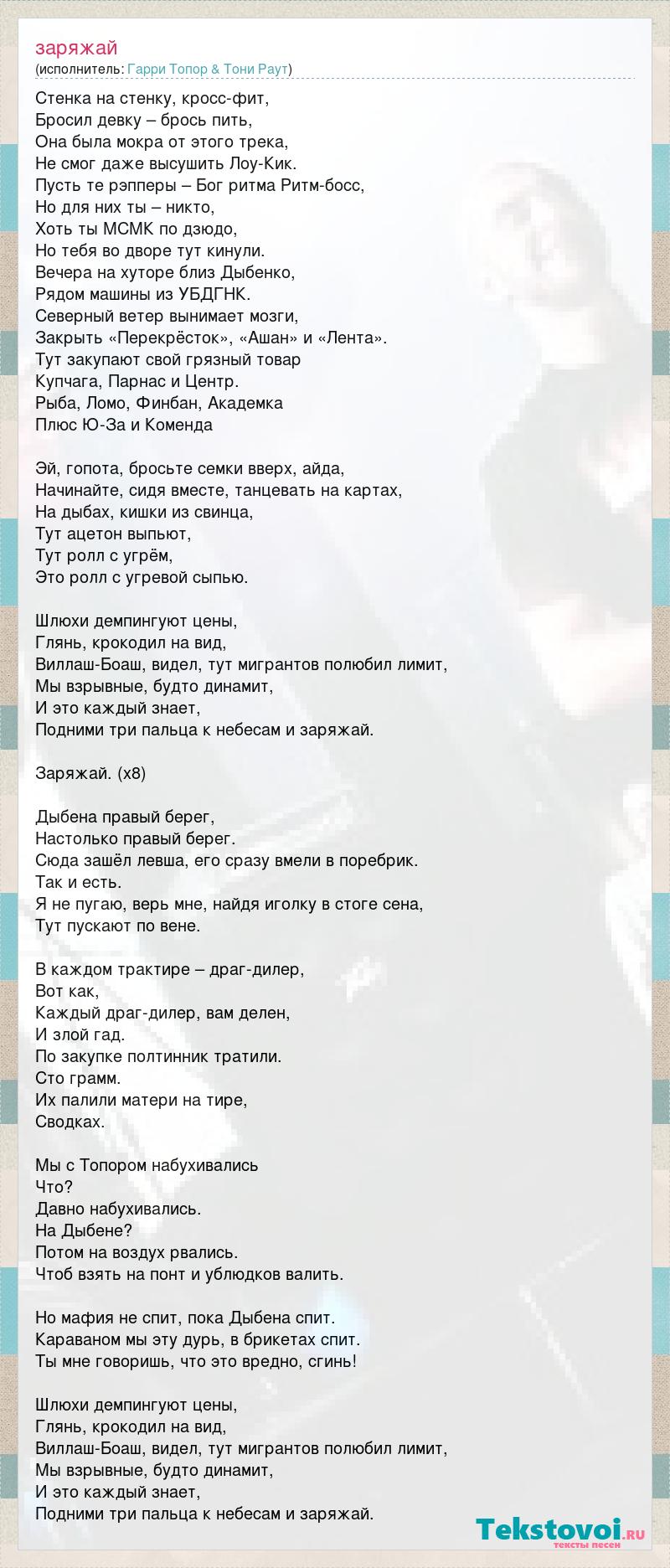 Стенка на стенку, кросс-фит, Бросил девку – брось пить, Она была мокра от этого трека, Не смог даже высушить Лоу-Кик. Пусть те рэпперы – Бог ритма Ритм-босс, Но для них ты – никто, Хоть ты МСМК по дзюдо, Но тебя во дворе тут кинули. Вечера на хуторе близ Дыбенко, Рядом машины из УБДГНК. Северный ветер вынимает мозги, Закрыть «Перекрёсток», «Ашан» и «Лента». Тут закупают свой грязный товар Купчага, Парнас и Центр. Рыба, Ломо, Финбан, Академка Плюс Ю-За и Коменда Эй, гопота, бросьте семки вверх, айда, Начинайте, сидя вместе, танцевать на картах, На дыбах, кишки из свинца, Тут ацетон выпьют, Тут ролл с угрём, Это ролл с угревой сыпью. Шлюхи демпингуют цены, Глянь, крокодил на вид, Виллаш-Боаш, видел, тут мигрантов полюбил лимит, Мы взрывные, будто динамит, И это каждый знает, Подними три пальца к небесам и заряжай. Заряжай. (х8) Дыбена правый берег, Настолько правый берег. Сюда зашёл левша, его сразу вмели в поребрик. Так и есть. Я не пугаю, верь мне, найдя иголку в стоге сена, Тут пускают по вене. В каждом трактире – драг-дилер, Вот как, Каждый драг-дилер, вам делен, И злой гад. По закупке полтинник тратили. Сто грамм. Их палили матери на тире, Сводках. Мы с Топором набухивались Что? Давно набухивались. На Дыбене? Потом на воздух рвались. Чтоб взять на понт и ублюдков валить. Но мафия не спит, пока Дыбена спит. Караваном мы эту дурь, в брикетах спит. Ты мне говоришь, что это вредно, сгинь! Шлюхи демпингуют цены, Глянь, крокодил на вид, Виллаш-Боаш, видел, тут мигрантов полюбил лимит, Мы взрывные, будто динамит, И это каждый знает, Подними три пальца к небесам и заряжай.