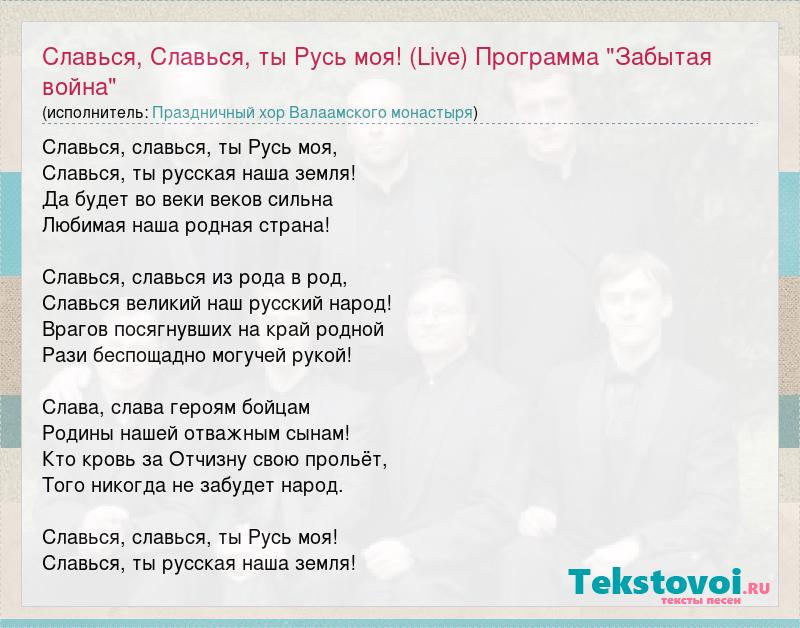 Славься, славься, ты Русь моя, Славься, ты русская наша земля! Да будет во веки веков сильна Любимая наша родная страна! Славься, славься из рода в род, Славься великий наш русский народ! Врагов посягнувших на край родной Рази беспощадно могучей рукой! Слава, слава героям бойцам Родины нашей отважным сынам! Кто кровь за Отчизну свою прольёт, Того никогда не забудет народ. Славься, славься, ты Русь моя! Славься, ты русская наша земля!