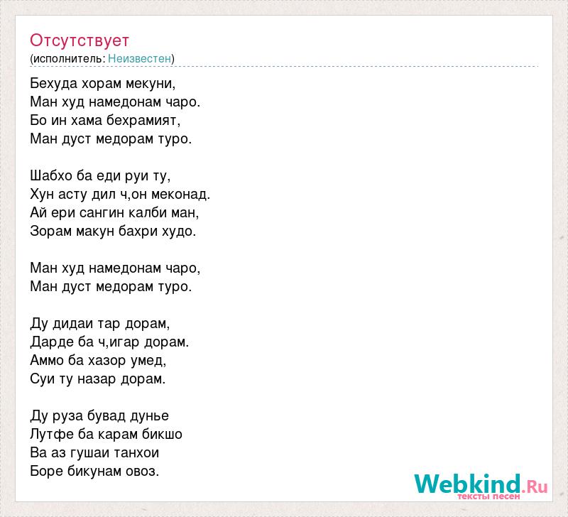 Бехуда хорам мекуни, Ман худ намедонам чаро. Бо ин хама бехрамият, Ман дуст медорам туро. Шабхо ба еди руи ту, Хун асту дил ч,он меконад. Ай ери сангин калби ман, Зорам макун бахри худо. Ман худ намедонам чаро, Ман дуст медорам туро. Ду дидаи тар дорам, Дарде ба ч,игар дорам. Аммо ба хазор умед, Суи ту назар дорам. Ду руза бувад дунье Лутфе ба карам бикшо Ва аз гушаи танхои Боре бикунам овоз.