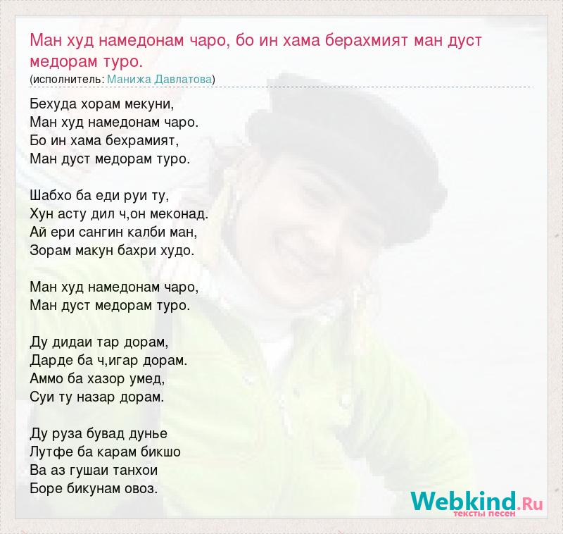 Главная→Исполнители→Манижа Давлатова→Ман худ намедонам чаро, бо ин хама берахмият ман дуст медорам туро.