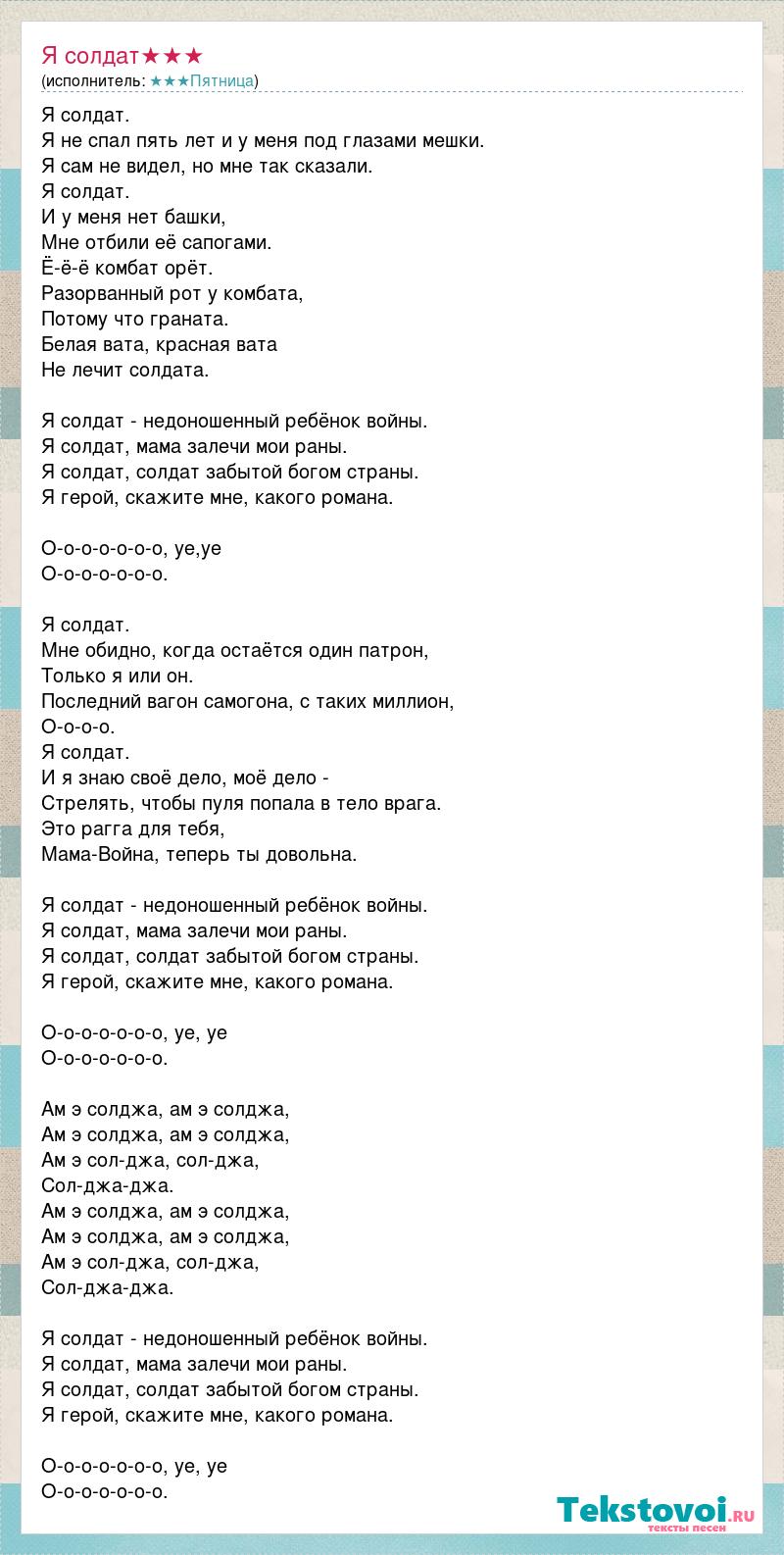 Я солдат. Я не спал пять лет и у меня под глазами мешки. Я сам не видел, но мне так сказали. Я солдат. И у меня нет башки, Мне отбили её сапогами. Ё-ё-ё комбат орёт. Разорванный рот у комбата, Потому что граната. Белая вата, красная вата Hе лечит солдата. Я солдат - недоношенный ребёнок войны. Я солдат, мама залечи мои раны. Я солдат, солдат забытой богом страны. Я герой, скажите мне, какого романа. О-о-о-о-о-о-о, уе,уе О-о-о-о-о-о-о. Я солдат. Мне обидно, когда остаётся один патрон, Только я или он. Последний вагон самогона, с таких миллион, О-о-о-о. Я солдат. И я знаю своё дело, моё дело - Стрелять, чтобы пуля попала в тело врага. Это рагга для тебя, Мама-Война, теперь ты довольна. Я солдат - недоношенный ребёнок войны. Я солдат, мама залечи мои раны. Я солдат, солдат забытой богом страны. Я герой, скажите мне, какого романа. О-о-о-о-о-о-о, уе, уе О-о-о-о-о-о-о. Ам э солджа, ам э солджа, Ам э солджа, ам э солджа, Ам э сол-джа, сол-джа, Сол-джа-джа. Ам э солджа, ам э солджа, Ам э солджа, ам э солджа, Ам э сол-джа, сол-джа, Сол-джа-джа. Я солдат - недоношенный ребёнок войны. Я солдат, мама залечи мои раны. Я солдат, солдат забытой богом страны. Я герой, скажите мне, какого романа. О-о-о-о-о-о-о, уе, уе О-о-о-о-о-о-о.
