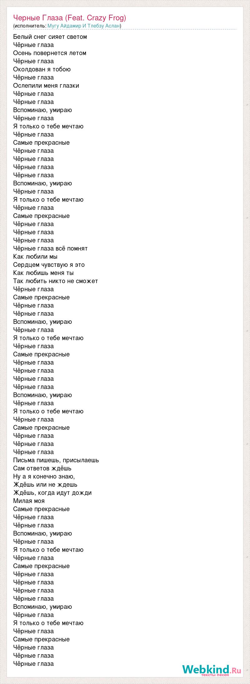 Белый снег сияет светом Чёрные глаза Осень повернется летом Чёрные глаза Околдован я тобою Чёрные глаза Ослепили меня глазки Чёрные глаза Чёрные глаза Вспоминаю, умираю Чёрные глаза Я только о тебе мечтаю Чёрные глаза Самые прекрасные Чёрные глаза Чёрные глаза Чёрные глаза Чёрные глаза Вспоминаю, умираю Чёрные глаза Я только о тебе мечтаю Чёрные глаза Самые прекрасные Чёрные глаза Чёрные глаза Чёрные глаза Чёрные глаза всё помнят Как любили мы Сердцем чувствую я это Как любишь меня ты Так любить никто не сможет Чёрные глаза Самые прекрасные Чёрные глаза Чёрные глаза Вспоминаю, умираю Чёрные глаза Я только о тебе мечтаю Чёрные глаза Самые прекрасные Чёрные глаза Чёрные глаза Чёрные глаза Чёрные глаза Вспоминаю, умираю Чёрные глаза Я только о тебе мечтаю Чёрные глаза Самые прекрасные Чёрные глаза Чёрные глаза Чёрные глаза Письма пишешь, присылаешь Сам ответов ждёшь Ну а я конечно знаю, Ждёшь или не ждешь Ждёшь, когда идут дожди Милая моя Самые прекрасные Чёрные глаза Чёрные глаза Вспоминаю, умираю Чёрные глаза Я только о тебе мечтаю Чёрные глаза Самые прекрасные Чёрные глаза Чёрные глаза Чёрные глаза Чёрные глаза Вспоминаю, умираю Чёрные глаза Я только о тебе мечтаю Чёрные глаза Самые прекрасные Чёрные глаза Чёрные глаза Чёрные глаза