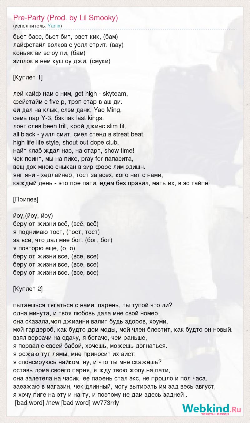 бьет басс, бьет бит, рвет кик, (бам) лайфстайл волков с уолл стрит. (вау) коньяк ви эс оу пи, (бам) зиплок в нем куш оу джи. (смуки) [Куплет 1] лей кайф нам с ним, get high - skyteam, фейстайм с five p, трэп стар в аш ди. ей дал на клык, слэм данк, Yao Ming, семь пар Y-3, бэкпак last kings. лонг слив been trill, крой джинс slim fit, all black - уилл смит, смёл стенд в streat beat. high life life style, shout out dope club, найт клаб ждал нас, на старт, show time! чек поинт, мы на пике, pray for папасита, вещ док мною сныкан в эир форс лим эдишн. янг яни - хедлайнер, тост за всех, кого нет с нами, каждый день - это пре пати, едем без правил, мать их, в эс тайпе. [Припев] йоу,(йоу, йоу) беру от жизни всё, (всё, всё) я поднимаю тост, (тост, тост) за все, что дал мне бог. (бог, бог) я повторю еще, (о, о) беру от жизни все, (все, все) беру от жизни все, (все, все) беру от жизни все. (все, все) [Куплет 2] пытаешься тягаться с нами, парень, ты тупой что ли? одна минута, и твоя любовь дала мне свой номер. она сказала,мол джианни валит будь здоров, хоуми, мой гардероб, как будто дом моды, мой член блестит, как будто он новый. взял версачи на сдачу, я богаче, чем раньше, я порвал с своей бабой, хочешь, можешь догнаться. я рожаю тут лямы, мне приносит их аист, я спонсируюсь найком, ну, и что ты мне скажешь? оставь дома своего парня, я жду твою жопу на пати, она залетела на часик, ее парень стал экс, не прошло и пол часа. заезжаю в магазин, чек длинный, могу вытирать им зад весь август, я хочу пиге на эту и на ту, и поэтому не дам здесь задней . [bad word] /new [bad word] wv773rrly