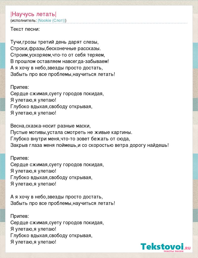 Текст песни: Тучи,грозы третий день дарят слезы, Строки,фразы,бесконечные рассказы. Строим,ускоряем,что-то от себя теряем, В прошлом оставляем навсегда-забываем! А я хочу в небо,звезды просто достать, Забыть про все проблемы,научиться летать! Припев: Сердце сжимая,суету городов покидая, Я улетаю,я улетаю! Глубоко вдыхая,свободу открывая, Я улетаю,я улетаю! Весна,сказка-носит разные маски, Пустые мотивы,устала смотреть не живые картины. Глубоко внутри меня,что-то зовет бежать от сюда, Закрыв глаза меня поймешь,и со скоростью ветра дорогу найдешь! Припев: Сердце сжимая,суету городов покидая, Я улетаю,я улетаю! Глубоко вдыхая,свободу открывая, Я улетаю,я улетаю! А я хочу в небо,звезды просто достать, Забыть про все проблемы,научиться летать! Припев: Сердце сжимая,суету городов покидая, Я улетаю,я улетаю! Глубоко вдыхая,свободу открывая, Я улетаю,я улетаю!