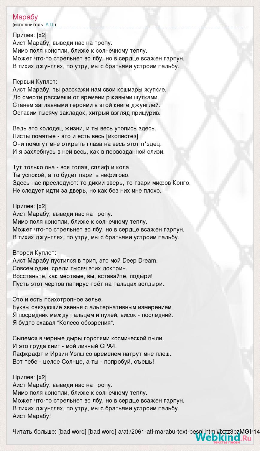Припев: [х2] Аист Марабу, выведи нас на тропу. Мимо поля конопли, ближе к солнечному теплу. Может что-то стрельнет во лбу, но в сердце всажен гарпун. В тихих джунглях, по утру, мы с братьями устроим пальбу. Первый Куплет: Аист Марабу, ты расскажи нам свои кошмары жуткие. До смерти рассмеши от времени ржавыми шутками. Станем заглавными героями в этой книге джунглей. Оставим тысячу закладок, хитрый взгляд прищурив. Ведь это колодец жизни, и ты весь утопись здесь. Листы помятые - это и есть весь [икопистез] Они помогут мне открыть глаза на весь этот п*здец. И я захлебнусь в ней весь, как в первозданной слизи. Тут только она - вся голая, сплиф и кола. Ты успокой, а то будет парить нефигово. Здесь нас преследуют: то дикий зверь, то твари мифов Конго. Не следует идти за дверь, но как без них мне плохо. Припев: [х2] Аист Марабу, выведи нас на тропу. Мимо поля конопли, ближе к солнечному теплу. Может что-то стрельнет во лбу, но в сердце всажен гарпун. В тихих джунглях, по утру, мы с братьями устроим пальбу. Второй Куплет: Аист Марабу пустился в трип, это мой Deep Dream. Совсем один, среди тысяч этих доктрин. Восстаньте, как мертвые, вы, вставайте, лодыри! Пусть этот чертов папирус трёт на пальцах волдыри. Это и есть психотропное зелье. Буквы связующие звенья с альтернативным измерением. Я посредник между пальцем и пулей, висок - последний. Я будто схавал "Колесо обозрения". Сыпемся в черные дыры горстями космической пыли. И это груда книг - мой личный CPA4. Лафкрафт и Ирвин Уэлш со временем натрут мне плеш. Вот тебе - целое Солнце, а ты - попробуй, съешь! Припев: [х2] Аист Марабу, выведи нас на тропу. Мимо поля конопли, ближе к солнечному теплу. Может что-то стрельнет во лбу, но в сердце всажен гарпун. В тихих джунглях, по утру, мы с братьями устроим пальбу. Аист Марабу! Читать больше: [bad word] [bad word] a/atl/2061-atl-marabu-text-pesni.html#ixzz3pzMGIr14