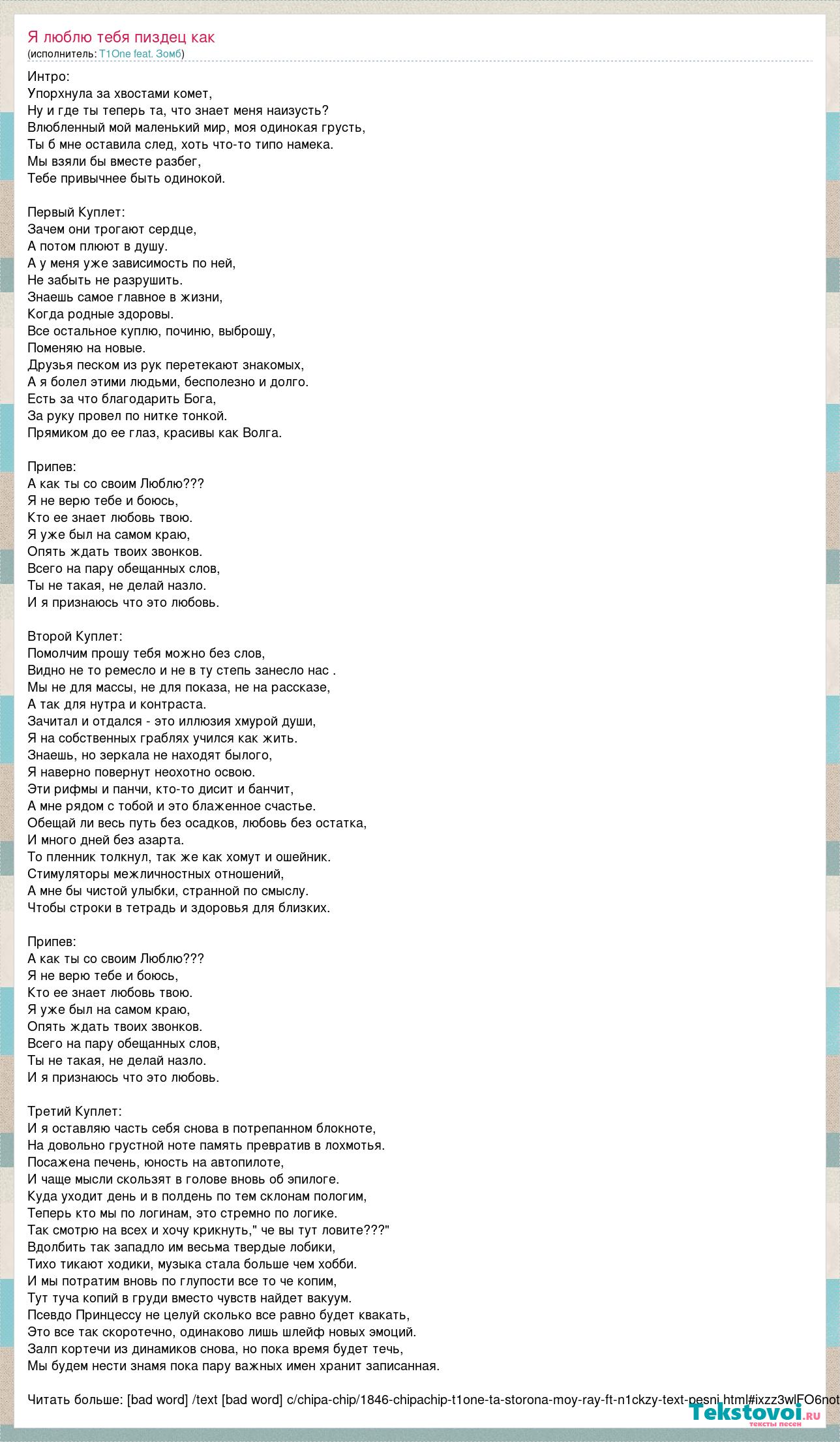 Интро: Упорхнула за хвостами комет, Ну и где ты теперь та, что знает меня наизусть? Влюбленный мой маленький мир, моя одинокая грусть, Ты б мне оставила след, хоть что-то типо намека. Мы взяли бы вместе разбег, Тебе привычнее быть одинокой. Первый Куплет: Зачем они трогают сердце, А потом плюют в душу. А у меня уже зависимость по ней, Не забыть не разрушить. Знаешь самое главное в жизни, Когда родные здоровы. Все остальное куплю, починю, выброшу, Поменяю на новые. Друзья песком из рук перетекают знакомых, А я болел этими людьми, бесполезно и долго. Есть за что благодарить Бога, За руку провел по нитке тонкой. Прямиком до ее глаз, красивы как Волга. Припев: А как ты со своим Люблю??? Я не верю тебе и боюсь, Кто ее знает любовь твою. Я уже был на самом краю, Опять ждать твоих звонков. Всего на пару обещанных слов, Ты не такая, не делай назло. И я признаюсь что это любовь. Второй Куплет: Помолчим прошу тебя можно без слов, Видно не то ремесло и не в ту степь занесло нас . Мы не для массы, не для показа, не на рассказе, А так для нутра и контраста. Зачитал и отдался - это иллюзия хмурой души, Я на собственных граблях учился как жить. Знаешь, но зеркала не находят былого, Я наверно повернут неохотно освою. Эти рифмы и панчи, кто-то дисит и банчит, А мне рядом с тобой и это блаженное счастье. Обещай ли весь путь без осадков, любовь без остатка, И много дней без азарта. То пленник толкнул, так же как хомут и ошейник. Стимуляторы межличностных отношений, А мне бы чистой улыбки, странной по смыслу. Чтобы строки в тетрадь и здоровья для близких. Припев: А как ты со своим Люблю??? Я не верю тебе и боюсь, Кто ее знает любовь твою. Я уже был на самом краю, Опять ждать твоих звонков. Всего на пару обещанных слов, Ты не такая, не делай назло. И я признаюсь что это любовь. Третий Куплет: И я оставляю часть себя снова в потрепанном блокноте, На довольно грустной ноте память превратив в лохмотья. Посажена печень, юность на автопилоте, И чаще мысли скользят в голове вновь об эпилоге. Куда уходит день и в полдень по тем склонам пологим, Теперь кто мы по логинам, это стремно по логике. Так смотрю на всех и хочу крикнуть," че вы тут ловите???" Вдолбить так западло им весьма твердые лобики, Тихо тикают ходики, музыка стала больше чем хобби. И мы потратим вновь по глупости все то че копим, Тут туча копий в груди вместо чувств найдет вакуум. Псевдо Принцессу не целуй сколько все равно будет квакать, Это все так скоротечно, одинаково лишь шлейф новых эмоций. Залп кортечи из динамиков снова, но пока время будет течь, Мы будем нести знамя пока пару важных имен хранит записанная. Читать больше: [bad word] /text [bad word] c/chipa-chip/1846-chipachip-t1one-ta-storona-moy-ray-ft-n1ckzy-text-pesni.html#ixzz3wlFO6not