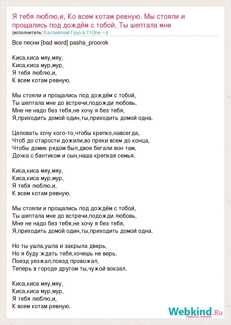 Все песни [bad word] pasha_proorok Киса,киса мяу,мяу, Киса,киса мур,мур, Я тебя люблю,и, К всем котам ревную. Мы стояли и прощались под дождём с тобой, Ты шептала мне до встречи,подожди любовь, Мне не надо без тебя,не хочу я без тебя, Я,приходить домой один,ты,приходить домой одна. Целовать хочу кого-то,чтобы крепко,навсегда, Чтоб до старости дожили,во преки всем до конца, Чтобы домик рядом был,двое бегали вон там, Дочка с бантиком и сын,наша крепкая семья. Киса,киса мяу,мяу, Киса,киса мур,мур, Я тебя люблю,и, К всем котам ревную. Мы стояли и прощались под дождём с тобой, Ты шептала мне до встречи,подожди любовь, Мне не надо без тебя,не хочу я без тебя, Я,приходить домой один,ты,приходить домой одна. Но ты ушла,ушла и закрыла дверь, Но я буду ждать тебя,хочешь не верь, Поезд уезжал,поезд провожал, Теперь в городе другом ты,чужой вокзал. Киса,киса мяу,мяу, Киса,киса мур,мур, Я тебя люблю,и, К всем котам ревную.