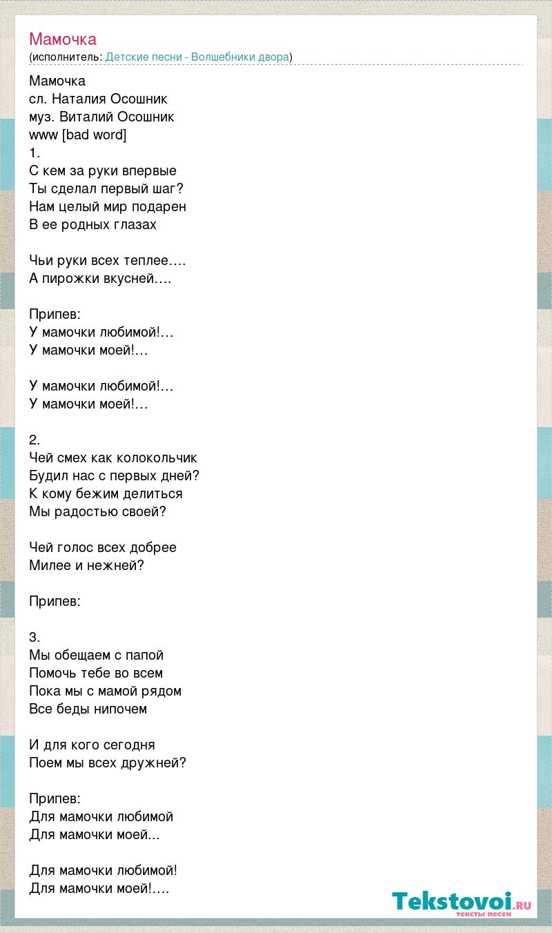 Мамочка сл. Наталия Осошник муз. Виталий Осошник www [bad word] 1. С кем за руки впервые Ты сделал первый шаг? Нам целый мир подарен В ее родных глазах Чьи руки всех теплее…. А пирожки вкусней…. Припев: У мамочки любимой!… У мамочки моей!… У мамочки любимой!… У мамочки моей!… 2. Чей смех как колокольчик Будил нас с первых дней? К кому бежим делиться Мы радостью своей? Чей голос всех добрее Милее и нежней? Припев: 3. Мы обещаем с папой Помочь тебе во всем Пока мы с мамой рядом Все беды нипочем И для кого сегодня Поем мы всех дружней? Припев: Для мамочки любимой Для мамочки моей... Для мамочки любимой! Для мамочки моей!….