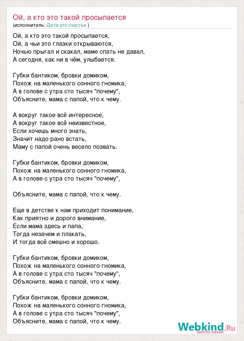 Ой, а кто это такой просыпается, Ой, а чьи это глазки открываются, Ночью прыгал и скакал, маме спать не давал, А сегодня, как ни в чём, улыбается. Губки бантиком, бровки домиком, Похож на маленького сонного гномика, А в голове с утра сто тысяч "почему", Объясните, мама с папой, что к чему. А вокруг такое всё интересное, А вокруг такое всё неизвестное, Если хочешь много знать, Значит надо рано встать, Маму с папой очень весело позвать. Губки бантиком, бровки домиком, Похож на маленького сонного гномика, А в голове с утра сто тысяч "почему", Объясните, мама с папой, что к чему. Еще в детстве к нам приходит понимание, Как приятно и дорого внимание, Если мама здесь и папа, Тогда незачем и плакать, И тогда всё смешно и хорошо. Губки бантиком, бровки домиком, Похож на маленького сонного гномика, А в голове с утра сто тысяч "почему", Объясните, мама с папой, что к чему. Губки бантиком, бровки домиком, Похож на маленького сонного гномика, А в голове с утра сто тысяч "почему", Объясните, мама с папой, что к чему.