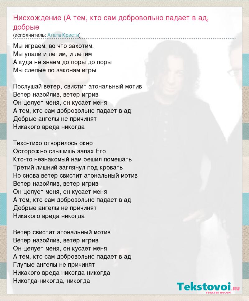 Мы играем, во что захотим. Мы упали и летим, и летим А куда не знаем до поры до поры Мы слепые по законам игры Послушай ветер, свистит атональный мотив Ветер назойлив, ветер игрив Он целует меня, он кусает меня А тем, кто сам добровольно падает в ад Добрые ангелы не причинят Никакого вреда никогда Тихо-тихо отворилось окно Осторожно слышишь запах Его Кто-то незнакомый нам решил помешать Третий лишний заглянул под кровать Но снова ветер свистит атональный мотив Ветер назойлив, ветер игрив Он целует меня, он кусает меня А тем, кто сам добровольно падает в ад Добрые ангелы не причинят Никакого вреда никогда Ветер свистит атональный мотив Ветер назойлив, ветер игрив Он целует меня, он кусает меня А тем, кто сам добровольно падает в ад Глупые ангелы не причинят Никакого вреда никогда-никогда Никогда-никогда, никогда
