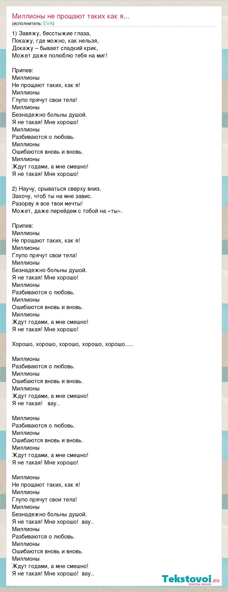 1) Завяжу, бесстыжие глаза, Покажу, где можно, как нельзя, Докажу – бывает сладкий крик, Может даже полюблю тебя на миг! Припев: Миллионы Не прощают таких, как я! Миллионы Глупо прячут свои тела! Миллионы Безнадежно больны душой. Я не такая! Мне хорошо! Миллионы Разбиваются о любовь. Миллионы Ошибаются вновь и вновь. Миллионы Ждут годами, а мне смешно! Я не такая! Мне хорошо! 2) Научу, срываться сверху вниз. Захочу, чтоб ты на мне завис. Разорву я все твои мечты! Может, даже перейдем с тобой на «ты». Припев: Миллионы Не прощают таких, как я! Миллионы Глупо прячут свои тела! Миллионы Безнадежно больны душой. Я не такая! Мне хорошо! Миллионы Разбиваются о любовь. Миллионы Ошибаются вновь и вновь. Миллионы Ждут годами, а мне смешно! Я не такая! Мне хорошо! Хорошо, хорошо, хорошо, хорошо, хорошо..... Миллионы Разбиваются о любовь. Миллионы Ошибаются вновь и вновь. Миллионы Ждут годами, а мне смешно! Я не такая! вау.. Миллионы Разбиваются о любовь. Миллионы Ошибаются вновь и вновь. Миллионы Ждут годами, а мне смешно! Я не такая! Мне хорошо! Миллионы Не прощают таких, как я! Миллионы Глупо прячут свои тела! Миллионы Безнадежно больны душой. Я не такая! Мне хорошо! вау.. Миллионы Разбиваются о любовь. Миллионы Ошибаются вновь и вновь. Миллионы Ждут годами, а мне смешно! Я не такая! Мне хорошо! вау..