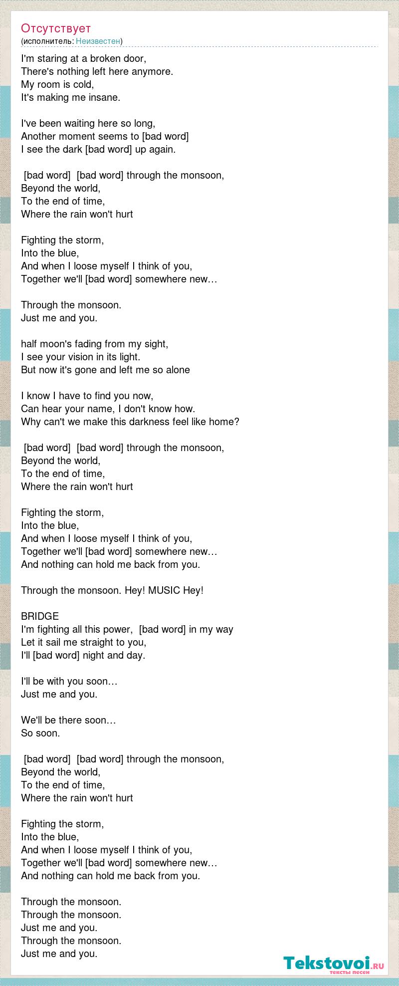 I'm staring at a broken door, There's nothing left here anymore. My room is cold, It's making me insane. I've been waiting here so long, Another moment seems to 've come, I see the dark clouds coming up again. CHORUS Running through the monsoon, Beyond the world, To the end of time, Where the rain won't hurt Fighting the storm, Into the blue, And when I loose myself I think of you, Together we'll be running somewhere new… Through the monsoon. Just me and you. half moon's fading from my sight, I see your vision in its light. But now it's gone and left me so alone I know I have to find you now, Can hear your name, I don't know how. Why can't we make this darkness feel like home? CHORUS Running through the monsoon, Beyond the world, To the end of time, Where the rain won't hurt Fighting the storm, Into the blue, And when I loose myself I think of you, Together we'll be running somewhere new… And nothing can hold me back from you. Through the monsoon. Hey! MUSIC Hey! BRIDGE I'm fighting all this power, Coming in my way Let it sail me straight to you, I'll be running night and day. I'll be with you soon… Just me and you. We'll be there soon… So soon. CHORUS Running through the monsoon, Beyond the world, To the end of time, Where the rain won't hurt Fighting the storm, Into the blue, And when I loose myself I think of you, Together we'll be running somewhere new… And nothing can hold me back from you. Through the monsoon. Through the monsoon. Just me and you. Through the monsoon. Just me and you.