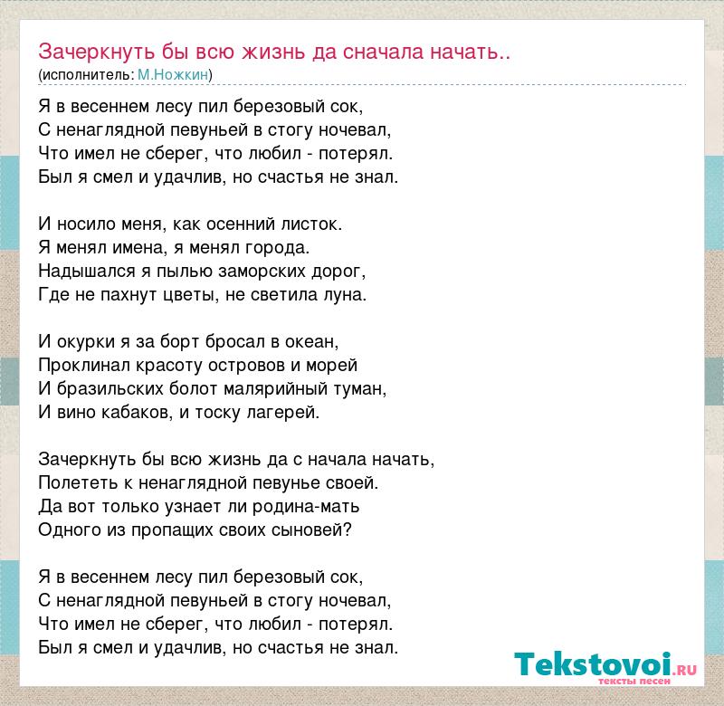 Я в весеннем лесу пил березовый сок, С ненаглядной певуньей в стогу ночевал, Что имел не сберег, что любил - потерял. Был я смел и удачлив, но счастья не знал. И носило меня, как осенний листок. Я менял имена, я менял города. Надышался я пылью заморских дорог, Где не пахнут цветы, не светила луна. И окурки я за борт бросал в океан, Проклинал красоту островов и морей И бразильских болот малярийный туман, И вино кабаков, и тоску лагерей. Зачеркнуть бы всю жизнь да с начала начать, Полететь к ненаглядной певунье своей. Да вот только узнает ли родина-мать Одного из пропащих своих сыновей? Я в весеннем лесу пил березовый сок, С ненаглядной певуньей в стогу ночевал, Что имел не сберег, что любил - потерял. Был я смел и удачлив, но счастья не знал.