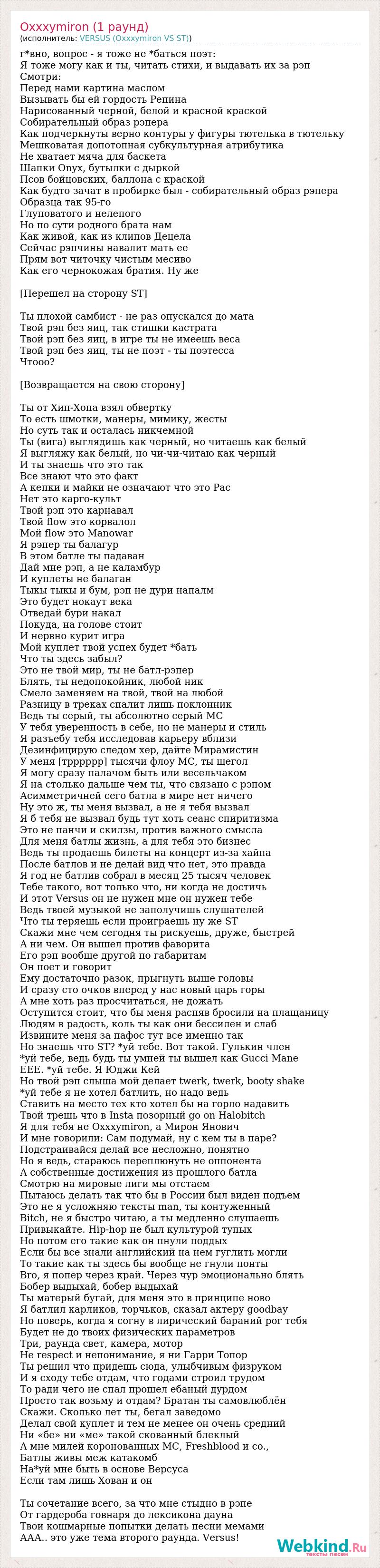 г*вно, вопрос - я тоже не *баться поэт: Я тоже могу как и ты, читать стихи, и выдавать их за рэп Смотри: Перед нами картина маслом Вызывать бы ей гордость Репина Нарисованный черной, белой и красной краской Собирательный образ рэпера Как подчеркнуты верно контуры у фигуры тютелька в тютельку Мешковатая допотопная субкультурная атрибутика Не хватает мяча для баскета Шапки Onyx, бутылки с дыркой Псов бойцовских, баллона с краской Как будто зачат в пробирке был - собирательный образ рэпера Образца так 95-го Глуповатого и нелепого Но по сути родного брата нам Как живой, как из клипов Децела Сейчас рэпчины навалит мать ее Прям вот читочку чистым месиво Как его чернокожая братия. Ну же [Перешел на сторону ST] Ты плохой самбист - не раз опускался до мата Твой рэп без яиц, так стишки кастрата Твой рэп без яиц, в игре ты не имеешь веса Твой рэп без яиц, ты не поэт - ты поэтесса Чтооо? [Возвращается на свою сторону] Ты от Хип-Хопа взял обвертку То есть шмотки, манеры, мимику, жесты Но суть так и осталась никчемной Ты (вига) выглядишь как черный, но читаешь как белый Я выгляжу как белый, но чи-чи-читаю как черный И ты знаешь что это так Все знают что это факт А кепки и майки не означают что это Pac Нет это карго-культ Твой рэп это карнавал Твой flow это корвалол Мой flow это Manowar Я рэпер ты балагур В этом батле ты падаван Дай мне рэп, а не каламбур И куплеты не балаган Тыкы тыкы и бум, рэп не дури напалм Это будет нокаут века Отведай бури накал Покуда, на голове стоит И нервно курит игра Мой куплет твой успех будет *бать Что ты здесь забыл? Это не твой мир, ты не батл-рэпер Блять, ты недопокойник, любой ник Смело заменяем на твой, твой на любой Разницу в треках спалит лишь поклонник Ведь ты серый, ты абсолютно серый МС У тебя уверенность в себе, но не манеры и стиль Я разъебу тебя исследовав карьеру вблизи Дезинфицирую следом хер, дайте Мирамистин У меня [трррррр] тысячи флоу МС, ты щегол Я могу сразу палачом быть или весельчаком Я на столько дальше чем ты, что связано с рэпом Асимметричней сего батла в мире нет ничего Ну это ж, ты меня вызвал, а не я тебя вызвал Я б тебя не вызвал будь тут хоть сеанс спиритизма Это не панчи и скилзы, против важного смысла Для меня батлы жизнь, а для тебя это бизнес Ведь ты продаешь билеты на концерт из-за хайпа После батлов и не делай вид что нет, это правда Я год не батлив собрал в месяц 25 тысяч человек Тебе такого, вот только что, ни когда не достичь И этот Versus он не нужен мне он нужен тебе Ведь твоей музыкой не заполучишь слушателей Что ты теряешь если проиграешь ну же ST Скажи мне чем сегодня ты рискуешь, друже, быстрей А ни чем. Он вышел против фаворита Его рэп вообще другой по габаритам Он поет и говорит Ему достаточно разок, прыгнуть выше головы И сразу сто очков вперед у нас новый царь горы А мне хоть раз просчитаться, не дожать Оступится стоит, что бы меня распяв бросили на плащаницу Людям в радость, коль ты как они бессилен и слаб Извините меня за пафос тут все именно так Но знаешь что ST? *уй тебе. Вот такой. Гулькин член *уй тебе, ведь будь ты умней ты вышел как Gucci Mane ЕЕЕ. *уй тебе. Я Юджи Кей Но твой рэп слыша мой делает twerk, twerk, booty shake *уй тебе я не хотел батлить, но надо ведь Ставить на место тех кто хотел бы на горло надавить Твой трешь что в Insta позорный go on Halobitch Я для тебя не Oxxxymiron, а Мирон Янович И мне говорили: Сам подумай, ну с кем ты в паре? Подстраивайся дел