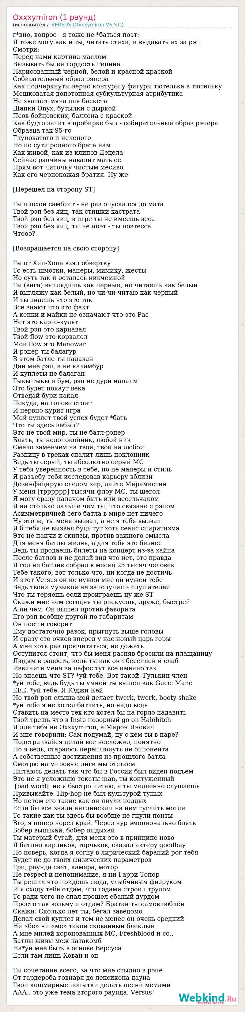 г*вно, вопрос - я тоже не *баться поэт: Я тоже могу как и ты, читать стихи, и выдавать их за рэп Смотри: Перед нами картина маслом Вызывать бы ей гордость Репина Нарисованный черной, белой и красной краской Собирательный образ рэпера Как подчеркнуты верно контуры у фигуры тютелька в тютельку Мешковатая допотопная субкультурная атрибутика Не хватает мяча для баскета Шапки Onyx, бутылки с дыркой Псов бойцовских, баллона с краской Как будто зачат в пробирке был - собирательный образ рэпера Образца так 95-го Глуповатого и нелепого Но по сути родного брата нам Как живой, как из клипов Децела Сейчас рэпчины навалит мать ее Прям вот читочку чистым месиво Как его чернокожая братия. Ну же [Перешел на сторону ST] Ты плохой самбист - не раз опускался до мата Твой рэп без яиц, так стишки кастрата Твой рэп без яиц, в игре ты не имеешь веса Твой рэп без яиц, ты не поэт - ты поэтесса Чтооо? [Возвращается на свою сторону] Ты от Хип-Хопа взял обвертку То есть шмотки, манеры, мимику, жесты Но суть так и осталась никчемной Ты (вига) выглядишь как черный, но читаешь как белый Я выгляжу как белый, но чи-чи-читаю как черный И ты знаешь что это так Все знают что это факт А кепки и майки не означают что это Pac Нет это карго-культ Твой рэп это карнавал Твой flow это корвалол Мой flow это Manowar Я рэпер ты балагур В этом батле ты падаван Дай мне рэп, а не каламбур И куплеты не балаган Тыкы тыкы и бум, рэп не дури напалм Это будет нокаут века Отведай бури накал Покуда, на голове стоит И нервно курит игра Мой куплет твой успех будет *бать Что ты здесь забыл? Это не твой мир, ты не батл-рэпер Блять, ты недопокойник, любой ник Смело заменяем на твой, твой на любой Разницу в треках спалит лишь поклонник Ведь ты серый, ты абсолютно серый МС У тебя уверенность в себе, но не манеры и стиль Я разъебу тебя исследовав карьеру вблизи Дезинфицирую следом хер, дайте Мирамистин У меня [трррррр] тысячи флоу МС, ты щегол Я могу сразу палачом быть или весельчаком Я на столько дальше чем ты, что связано с рэпом Асимметричней сего батла в мире нет ничего Ну это ж, ты меня вызвал, а не я тебя вызвал Я б тебя не вызвал будь тут хоть сеанс спиритизма Это не панчи и скилзы, против важного смысла Для меня батлы жизнь, а для тебя это бизнес Ведь ты продаешь билеты на концерт из-за хайпа После батлов и не делай вид что нет, это правда Я год не батлив собрал в месяц 25 тысяч человек Тебе такого, вот только что, ни когда не достичь И этот Versus он не нужен мне он нужен тебе Ведь твоей музыкой не заполучишь слушателей Что ты теряешь если проиграешь ну же ST Скажи мне чем сегодня ты рискуешь, друже, быстрей А ни чем. Он вышел против фаворита Его рэп вообще другой по габаритам Он поет и говорит Ему достаточно разок, прыгнуть выше головы И сразу сто очков вперед у нас новый царь горы А мне хоть раз просчитаться, не дожать Оступится стоит, что бы меня распяв бросили на плащаницу Людям в радость, коль ты как они бессилен и слаб Извините меня за пафос тут все именно так Но знаешь что ST? *уй тебе. Вот такой. Гулькин член *уй тебе, ведь будь ты умней ты вышел как Gucci Mane ЕЕЕ. *уй тебе. Я Юджи Кей Но твой рэп слыша мой делает twerk, twerk, booty shake *уй тебе я не хотел батлить, но надо ведь Ставить на место тех кто хотел бы на горло надавить Твой трешь что в Insta позорный go on Halobitch Я для тебя не Oxxxymiron, а Мирон Янович И мне говорили: Сам подумай, ну с кем ты в паре? Подстраивайся дел