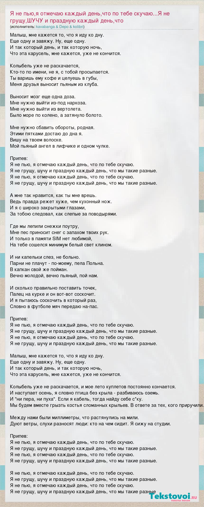 Малыш, мне кажется то, что я иду ко дну. Еще одну и завяжу. Ну, еще одну. И так который день, и так которую ночь, Что эта карусель, мне кажется, уже не кончится. Колыбель уже не раскачается, Кто-то по имени, не я, с тобой просыпается. Ты варишь ему кофе и целуешь в губы, Меня друзья выносит пьяным из клуба. Выносит мозг еще одна доза. Мне нужно выйти из-под наркоза. Мне нужно выйти из вертолета. Было море по колено, а затянуло болото. Мне нужно сбавить обороты, родная. Этими пятками достаю до дна я. Вишу на твоем волоске. Мой пьяный ангел в лифчике и одном чулке. Припев: Я не пью, я отмечаю каждый день, что по тебе скучаю. Я не грущу, шучу и праздную каждый день, что мы такие разные. Я не пью, я отмечаю каждый день, что по тебе скучаю. Я не грущу, шучу и праздную каждый день, что мы такие разные. А мне так нравится, как ты мне врешь. Ведь правда режет хуже, чем кухонный нож. И я с широко закрытыми глазами, За тобою следовал, как слепые за поводырями. Где мы лепили снежки поутру, Мне пес приносит снег с запахом твоих рук. И только в памяти SIM нет любимой, На тебе сошелся минимум белый свет клином. И ни капельки слез, не больно. Парни не плачут - по-моему, пела Польна. В капкан свой же пойман. Вечно молодой, вечно пьяный, пой нам. И сколько правильно поставить точек, Палец на курке и он вот-вот соскочит. И я пытаюсь соскочить в который раз, Словно в футболе мяч передаю на-пас. Припев: Я не пью, я отмечаю каждый день, что по тебе скучаю. Я не грущу, шучу и праздную каждый день, что мы такие разные. Я не пью, я отмечаю каждый день, что по тебе скучаю. Я не грущу, шучу и праздную каждый день, что мы такие разные. Малыш, мне кажется то, что я иду ко дну. Еще одну и завяжу. Ну, еще одну. И так который день, и так которую ночь, Что эта карусель, мне кажется, уже не кончится. Колыбель уже не раскачается, и мое лето куплетов постоянно кончается. И наступает осень, я словно птица без крыла - разбиваюсь оземь. И "ни пера, ни пуха". Если я кабель, тогда найду себе с*ку. Мы будем вместе грызть костья сломанных крыльев. В ответе за тех, кого приручили. Между нами были миллиметры, что растянулись на мили. Дуют ветры, слухи разносят люди: кто на чем сидит. Я сижу на студии. Припев: Я не пью, я отмечаю каждый день, что по тебе скучаю. Я не грущу, шучу и праздную каждый день, что мы такие разные. Я не пью, я отмечаю каждый день, что по тебе скучаю. Я не грущу, шучу и праздную каждый день, что мы такие разные. Я не пью, я отмечаю каждый день, что по тебе скучаю. Я не грущу, шучу и праздную каждый день, что мы такие разные. Я не пью, я отмечаю каждый день, что по тебе скучаю. Я не грущу, шучу и праздную каждый день, что мы такие разные
