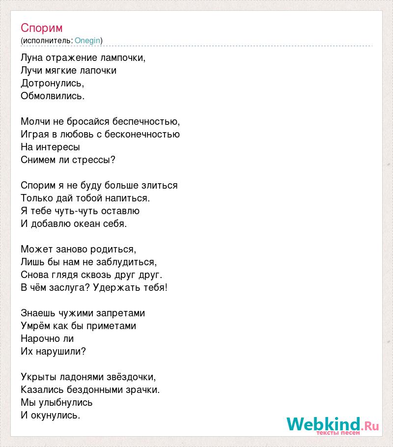 Луна отражение лампочки, Лучи мягкие лапочки Дотронулись, Обмолвились. Молчи не бросайся беспечностью, Играя в любовь с бесконечностью На интересы Снимем ли стрессы? Спорим я не буду больше злиться Только дай тобой напиться. Я тебе чуть-чуть оставлю И добавлю океан себя. Может заново родиться, Лишь бы нам не заблудиться, Снова глядя сквозь друг друг. В чём заслуга? Удержать тебя! Знаешь чужими запретами Умрём как бы приметами Нарочно ли Их нарушили? Укрыты ладонями звёздочки, Казались бездонными зрачки. Мы улыбнулись И окунулись.