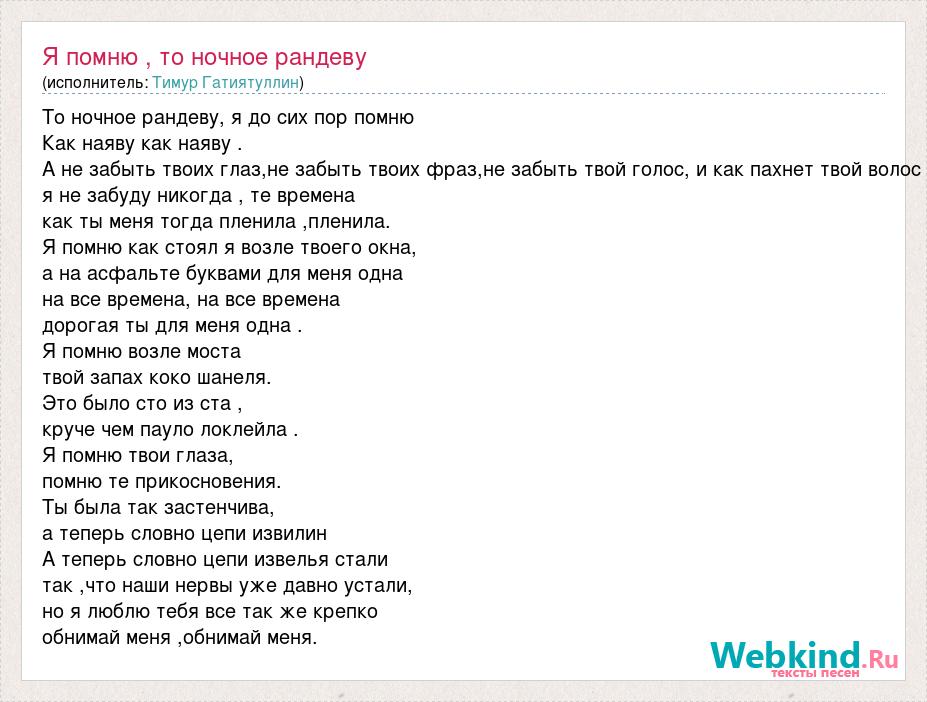 То ночное рандеву, я до сих пор помню Как наяву как наяву . А не забыть твоих глаз,не забыть твоих фраз,не забыть твой голос, и как пахнет твой волос я не забуду никогда , те времена как ты меня тогда пленила ,пленила. Я помню как стоял я возле твоего окна, а на асфальте буквами для меня одна на все времена, на все времена дорогая ты для меня одна . Я помню возле моста твой запах коко шанеля. Это было сто из ста , круче чем пауло локлейла . Я помню твои глаза, помню те прикосновения. Ты была так застенчива, а теперь словно цепи извилин А теперь словно цепи извелья стали так ,что наши нервы уже давно устали, но я люблю тебя все так же крепко обнимай меня ,обнимай меня.