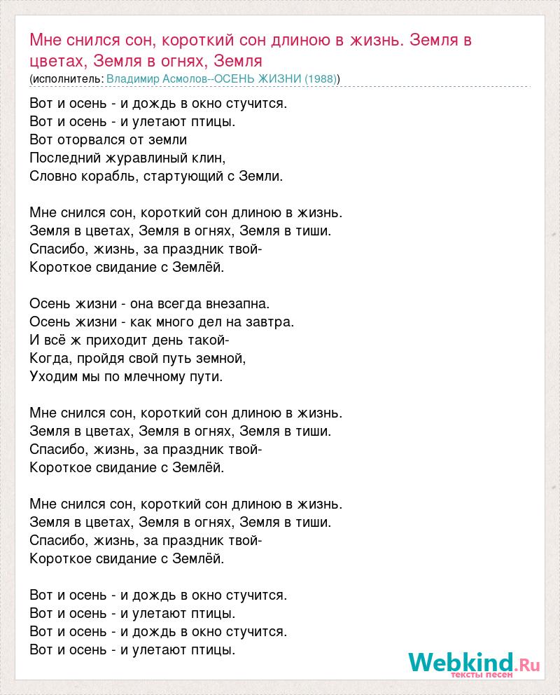 Вот и осень - и дождь в окно стучится. Вот и осень - и улетают птицы. Вот оторвался от земли Последний журавлиный клин, Словно корабль, стартующий с Земли. Мне снился сон, короткий сон длиною в жизнь. Земля в цветах, Земля в огнях, Земля в тиши. Спасибо, жизнь, за праздник твой- Короткое свидание с Землёй. Осень жизни - она всегда внезапна. Осень жизни - как много дел на завтра. И всё ж приходит день такой- Когда, пройдя свой путь земной, Уходим мы по млечному пути. Мне снился сон, короткий сон длиною в жизнь. Земля в цветах, Земля в огнях, Земля в тиши. Спасибо, жизнь, за праздник твой- Короткое свидание с Землёй. Мне снился сон, короткий сон длиною в жизнь. Земля в цветах, Земля в огнях, Земля в тиши. Спасибо, жизнь, за праздник твой- Короткое свидание с Землёй. Вот и осень - и дождь в окно стучится. Вот и осень - и улетают птицы. Вот и осень - и дождь в окно стучится. Вот и осень - и улетают птицы.