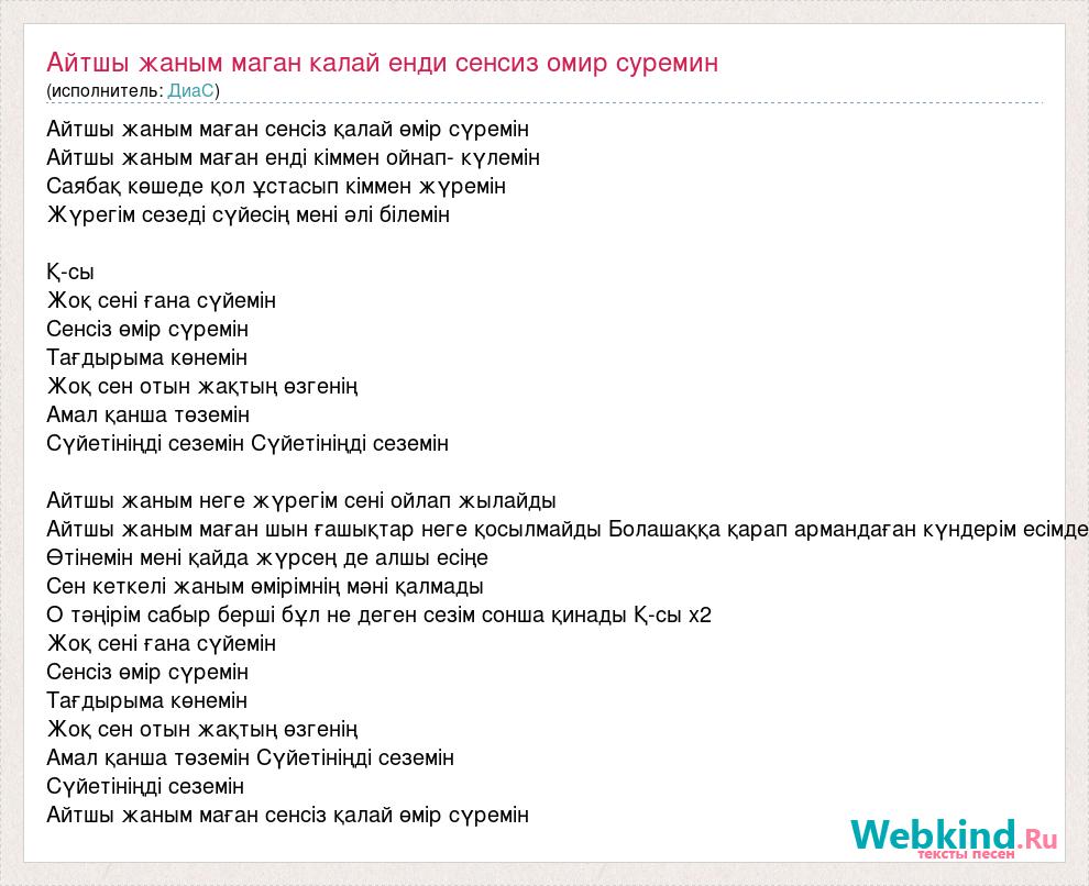 Айтшы жаным маған сенсіз қалай өмір сүремін Айтшы жаным маған енді кіммен ойнап- күлемін Саябақ көшеде қол ұстасып кіммен жүремін Жүрегім сезеді сүйесің мені әлі білемін Қ-сы Жоқ сені ғана сүйемін Сенсіз өмір сүремін Тағдырыма көнемін Жоқ сен отын жақтың өзгенің Амал қанша төземін Сүйетініңді сеземін Сүйетініңді сеземін Айтшы жаным неге жүрегім сені ойлап жылайды Айтшы жаным маған шын ғашықтар неге қосылмайды Болашаққа қарап армандаған күндерім есімде Өтінемін мені қайда жүрсең де алшы есіңе Сен кеткелі жаным өмірімнің мәні қалмады О тәңірім сабыр берші бұл не деген сезім сонша қинады Қ-сы х2 Жоқ сені ғана сүйемін Сенсіз өмір сүремін Тағдырыма көнемін Жоқ сен отын жақтың өзгенің Амал қанша төземін Сүйетініңді сеземін Сүйетініңді сеземін Айтшы жаным маған сенсіз қалай өмір сүремін