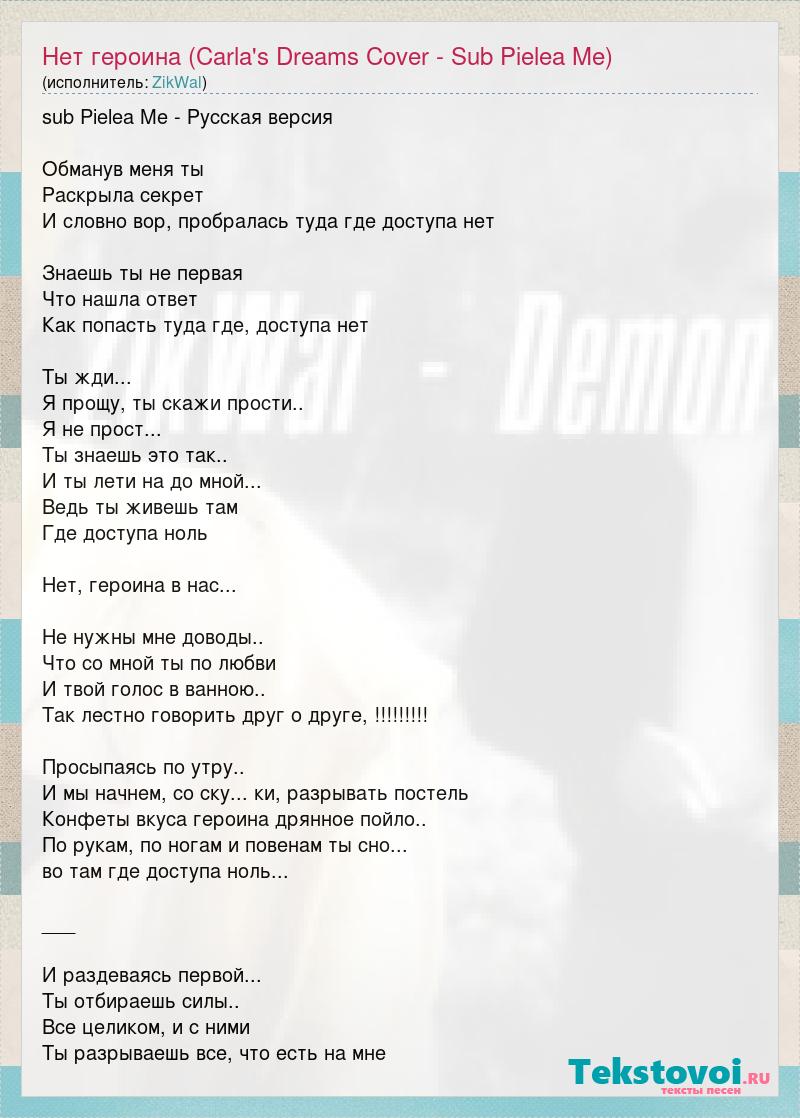 sub Pielea Me - Русская версия Обманув меня ты Раскрыла секрет И словно вор, пробралась туда где доступа нет Знаешь ты не первая Что нашла ответ Как попасть туда где, доступа нет Ты жди... Я прощу, ты скажи прости.. Я не прост... Ты знаешь это так.. И ты лети на до мной... Ведь ты живешь там Где доступа ноль Нет, героина в нас... Не нужны мне доводы.. Что со мной ты по любви И твой голос в ванною.. Так лестно говорить друг о друге, !!!!!!!!! Просыпаясь по утру.. И мы начнем, со ску... ки, разрывать постель Конфеты вкуса героина дрянное пойло.. По рукам, по ногам и повенам ты сно... во там где доступа ноль... ___ И раздеваясь первой... Ты отбираешь силы.. Все целиком, и с ними Ты разрываешь все, что есть на мне