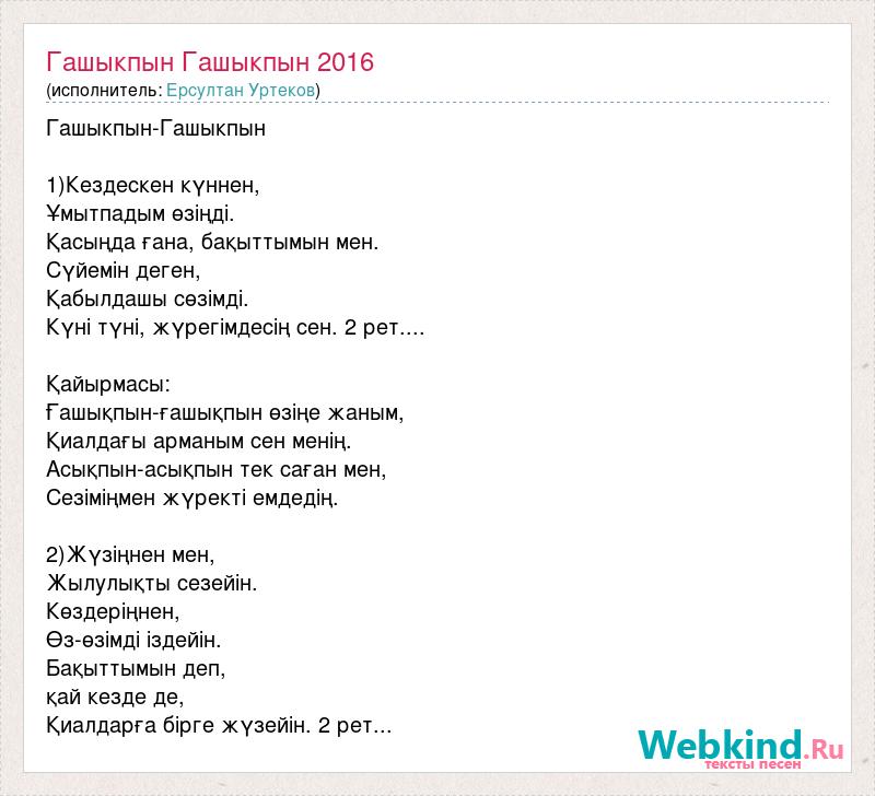 Гашыкпын-Гашыкпын 1)Кездескен күннен, Ұмытпадым өзіңді. Қасыңда ғана, бақыттымын мен. Сүйемін деген, Қабылдашы сөзімді. Күні түні, жүрегімдесің сен. 2 рет.... Қайырмасы: Ғашықпын-ғашықпын өзіңе жаным, Қиалдағы арманым сен менің. Асықпын-асықпын тек саған мен, Сезіміңмен жүректі емдедің. 2)Жүзіңнен мен, Жылулықты сезейін. Көздеріңнен, Өз-өзімді іздейін. Бақыттымын деп, қай кезде де, Қиалдарға бірге жүзейін. 2 рет...