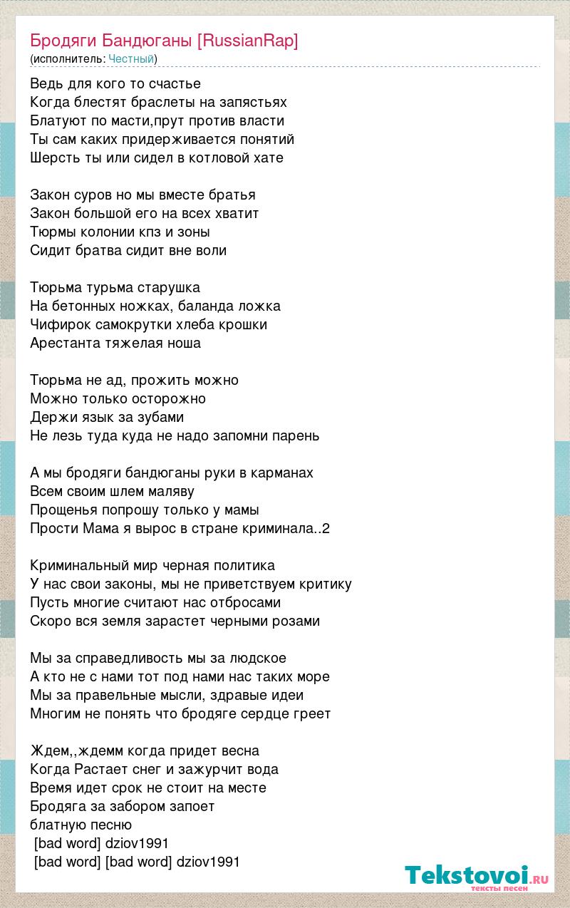 Ведь для кого то счастье Когда блестят браслеты на запястьях Блатуют по масти,прут против власти Ты сам каких придерживается понятий Шерсть ты или сидел в котловой хате Закон суров но мы вместе братья Закон большой его на всех хватит Тюрмы колонии кпз и зоны Сидит братва сидит вне воли Тюрьма турьма старушка На бетонных ножках, баланда ложка Чифирок самокрутки хлеба крошки Арестанта тяжелая ноша Тюрьма не ад, прожить можно Можно только осторожно Держи язык за зубами Не лезь туда куда не надо запомни парень А мы бродяги бандюганы руки в карманах Всем своим шлем маляву Прощенья попрошу только у мамы Прости Мама я вырос в стране криминала..2 Криминальный мир черная политика У нас свои законы, мы не приветствуем критику Пусть многие считают нас отбросами Скоро вся земля зарастет черными розами Мы за справедливость мы за людское А кто не с нами тот под нами нас таких море Мы за правельные мысли, здравые идеи Многим не понять что бродяге сердце греет Ждем,,ждемм когда придет весна Когда Растает снег и зажурчит вода Время идет срок не стоит на месте Бродяга за забором запоет блатную песню [bad word] dziov1991 [bad word] [bad word] dziov1991