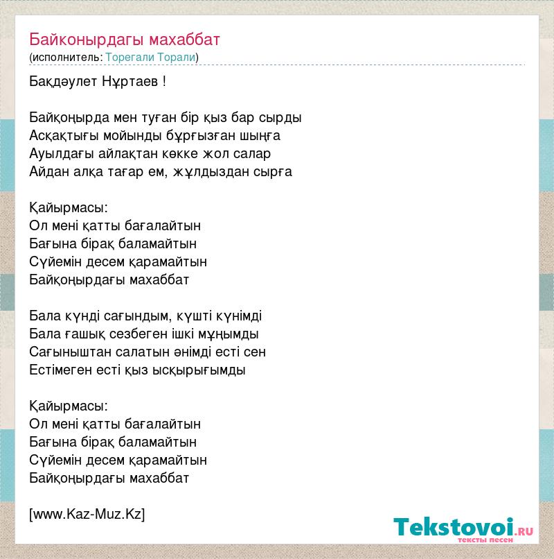 Бақдәулет Нұртаев ! Байқоңырда мен туған бір қыз бар сырды Асқақтығы мойынды бұрғызған шыңға Ауылдағы айлақтан көкке жол салар Айдан алқа тағар ем, жұлдыздан сырға Қайырмасы: Ол мені қатты бағалайтын Бағына бірақ баламайтын Сүйемін десем қарамайтын Байқоңырдағы махаббат Бала күнді сағындым, күшті күнімді Бала ғашық сезбеген ішкі мұңымды Сағыныштан салатын әнімді есті сен Естімеген есті қыз ысқырығымды Қайырмасы: Ол мені қатты бағалайтын Бағына бірақ баламайтын Сүйемін десем қарамайтын Байқоңырдағы махаббат [www.Kaz-Muz.Kz]