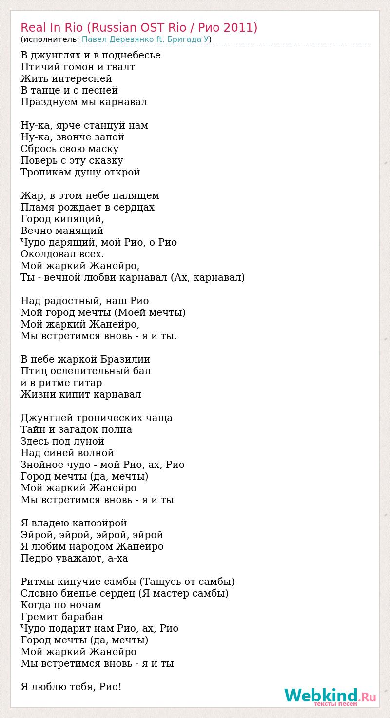 В джунглях и в поднебесье Птичий гомон и гвалт Жить интересней В танце и с песней Празднуем мы карнавал Ну-ка, ярче станцуй нам Ну-ка, звонче запой Сбрось свою маску Поверь с эту сказку Тропикам душу открой Жар, в этом небе палящем Пламя рождает в сердцах Город кипящий, Вечно манящий Чудо дарящий, мой Рио, о Рио Околдовал всех. Мой жаркий Жанейро, Ты - вечной любви карнавал (Ах, карнавал) Над радостный, наш Рио Мой город мечты (Моей мечты) Мой жаркий Жанейро, Мы встретимся вновь - я и ты. В небе жаркой Бразилии Птиц ослепительный бал и в ритме гитар Жизни кипит карнавал Джунглей тропических чаща Тайн и загадок полна Здесь под луной Над синей волной Знойное чудо - мой Рио, ах, Рио Город мечты (да, мечты) Мой жаркий Жанейро Мы встретимся вновь - я и ты Я владею капоэйрой Эйрой, эйрой, эйрой, эйрой Я любим народом Жанейро Педро уважают, а-ха Ритмы кипучие самбы (Тащусь от самбы) Словно биенье сердец (Я мастер самбы) Когда по ночам Гремит барабан Чудо подарит нам Рио, ах, Рио Город мечты (да, мечты) Мой жаркий Жанейро Мы встретимся вновь - я и ты Я люблю тебя, Рио!