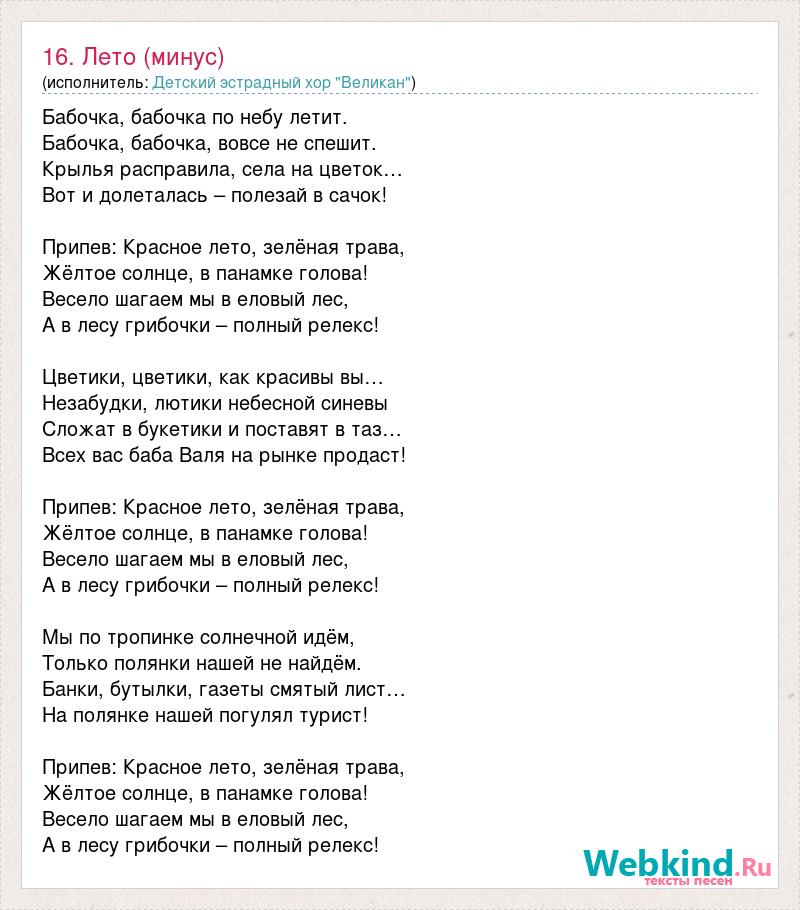 Бабочка, бабочка по небу летит. Бабочка, бабочка, вовсе не спешит. Крылья расправила, села на цветок… Вот и долеталась – полезай в сачок! Припев: Красное лето, зелёная трава, Жёлтое солнце, в панамке голова! Весело шагаем мы в еловый лес, А в лесу грибочки – полный релекс! Цветики, цветики, как красивы вы… Незабудки, лютики небесной синевы Сложат в букетики и поставят в таз… Всех вас баба Валя на рынке продаст! Припев: Красное лето, зелёная трава, Жёлтое солнце, в панамке голова! Весело шагаем мы в еловый лес, А в лесу грибочки – полный релекс! Мы по тропинке солнечной идём, Только полянки нашей не найдём. Банки, бутылки, газеты смятый лист… На полянке нашей погулял турист! Припев: Красное лето, зелёная трава, Жёлтое солнце, в панамке голова! Весело шагаем мы в еловый лес, А в лесу грибочки – полный релекс!