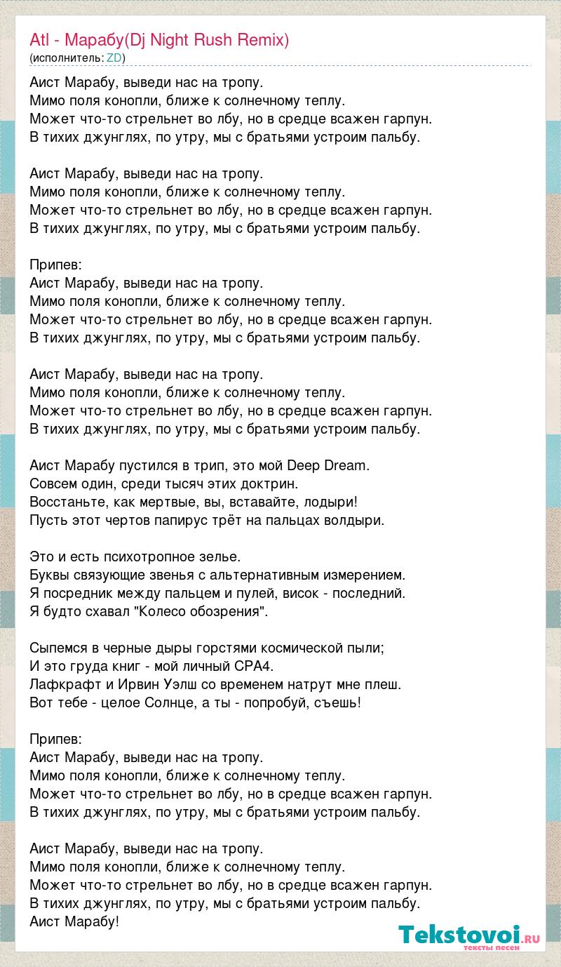 Аист Марабу, выведи нас на тропу. Мимо поля конопли, ближе к солнечному теплу. Может что-то стрельнет во лбу, но в средце всажен гарпун. В тихих джунглях, по утру, мы с братьями устроим пальбу. Аист Марабу, выведи нас на тропу. Мимо поля конопли, ближе к солнечному теплу. Может что-то стрельнет во лбу, но в средце всажен гарпун. В тихих джунглях, по утру, мы с братьями устроим пальбу. Припев: Аист Марабу, выведи нас на тропу. Мимо поля конопли, ближе к солнечному теплу. Может что-то стрельнет во лбу, но в средце всажен гарпун. В тихих джунглях, по утру, мы с братьями устроим пальбу. Аист Марабу, выведи нас на тропу. Мимо поля конопли, ближе к солнечному теплу. Может что-то стрельнет во лбу, но в средце всажен гарпун. В тихих джунглях, по утру, мы с братьями устроим пальбу. Аист Марабу пустился в трип, это мой Deep Dream. Совсем один, среди тысяч этих доктрин. Восстаньте, как мертвые, вы, вставайте, лодыри! Пусть этот чертов папирус трёт на пальцах волдыри. Это и есть психотропное зелье. Буквы связующие звенья с альтернативным измерением. Я посредник между пальцем и пулей, висок - последний. Я будто схавал "Колесо обозрения". Сыпемся в черные дыры горстями космической пыли; И это груда книг - мой личный CPA4. Лафкрафт и Ирвин Уэлш со временем натрут мне плеш. Вот тебе - целое Солнце, а ты - попробуй, съешь! Припев: Аист Марабу, выведи нас на тропу. Мимо поля конопли, ближе к солнечному теплу. Может что-то стрельнет во лбу, но в средце всажен гарпун. В тихих джунглях, по утру, мы с братьями устроим пальбу. Аист Марабу, выведи нас на тропу. Мимо поля конопли, ближе к солнечному теплу. Может что-то стрельнет во лбу, но в средце всажен гарпун. В тихих джунглях, по утру, мы с братьями устроим пальбу. Аист Марабу!
