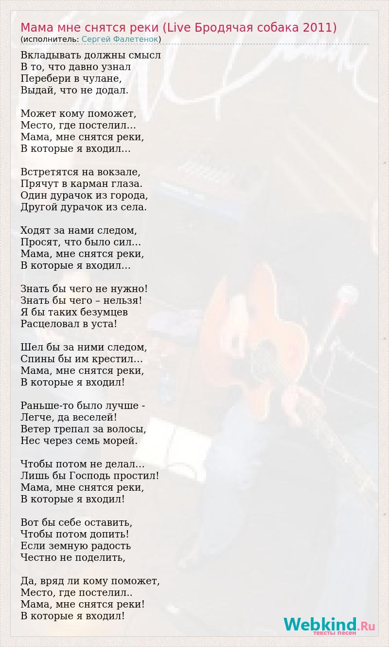 Вкладывать должны смысл В то, что давно узнал Перебери в чулане, Выдай, что не додал. Может кому поможет, Место, где постелил… Мама, мне снятся реки, В которые я входил… Встретятся на вокзале, Прячут в карман глаза. Один дурачок из города, Другой дурачок из села. Ходят за нами следом, Просят, что было сил… Мама, мне снятся реки, В которые я входил… Знать бы чего не нужно! Знать бы чего – нельзя! Я бы таких безумцев Расцеловал в уста! Шел бы за ними следом, Спины бы им крестил… Мама, мне снятся реки, В которые я входил! Раньше-то было лучше - Легче, да веселей! Ветер трепал за волосы, Нес через семь морей. Чтобы потом не делал… Лишь бы Господь простил! Мама, мне снятся реки, В которые я входил! Вот бы себе оставить, Чтобы потом допить! Если земную радость Честно не поделить, Да, вряд ли кому поможет, Место, где постелил.. Мама, мне снятся реки! В которые я входил!
