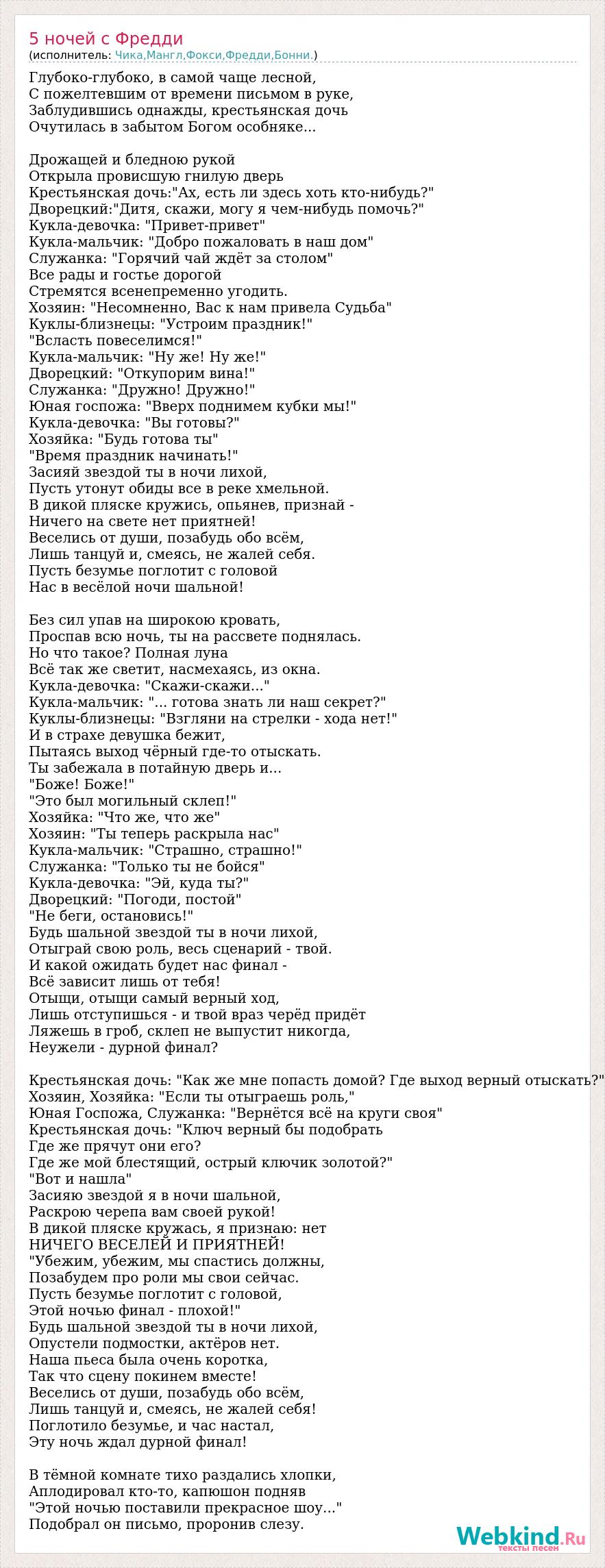 Глубоко-глубоко, в самой чаще лесной, С пожелтевшим от времени письмом в руке, Заблудившись однажды, крестьянская дочь Очутилась в забытом Богом особняке... Дрожащей и бледною рукой Открыла провисшую гнилую дверь Крестьянская дочь:"Ах, есть ли здесь хоть кто-нибудь?" Дворецкий:"Дитя, скажи, могу я чем-нибудь помочь?" Кукла-девочка: "Привет-привет" Кукла-мальчик: "Добро пожаловать в наш дом" Служанка: "Горячий чай ждёт за столом" Все рады и гостье дорогой Стремятся всенепременно угодить. Хозяин: "Несомненно, Вас к нам привела Судьба" Куклы-близнецы: "Устроим праздник!" "Всласть повеселимся!" Кукла-мальчик: "Ну же! Ну же!" Дворецкий: "Откупорим вина!" Служанка: "Дружно! Дружно!" Юная госпожа: "Вверх поднимем кубки мы!" Кукла-девочка: "Вы готовы?" Хозяйка: "Будь готова ты" "Время праздник начинать!" Засияй звездой ты в ночи лихой, Пусть утонут обиды все в реке хмельной. В дикой пляске кружись, опьянев, признай - Ничего на свете нет приятней! Веселись от души, позабудь обо всём, Лишь танцуй и, смеясь, не жалей себя. Пусть безумье поглотит с головой Нас в весёлой ночи шальной! Без сил упав на широкою кровать, Проспав всю ночь, ты на рассвете поднялась. Но что такое? Полная луна Всё так же светит, насмехаясь, из окна. Кукла-девочка: "Скажи-скажи..." Кукла-мальчик: "... готова знать ли наш секрет?" Куклы-близнецы: "Взгляни на стрелки - хода нет!" И в страхе девушка бежит, Пытаясь выход чёрный где-то отыскать. Ты забежала в потайную дверь и... "Боже! Боже!" "Это был могильный склеп!" Хозяйка: "Что же, что же" Хозяин: "Ты теперь раскрыла нас" Кукла-мальчик: "Страшно, страшно!" Служанка: "Только ты не бойся" Кукла-девочка: "Эй, куда ты?" Дворецкий: "Погоди, постой" "Не беги, остановись!" Будь шальной звездой ты в ночи лихой, Отыграй свою роль, весь сценарий - твой. И какой ожидать будет нас финал - Всё зависит лишь от тебя! Отыщи, отыщи самый верный ход, Лишь отступишься - и твой враз черёд придёт Ляжешь в гроб, склеп не выпустит никогда, Неужели - дурной финал? Крестьянская дочь: "Как же мне попасть домой? Где выход верный отыскать?" Хозяин, Хозяйка: "Если ты отыграешь роль," Юная Госпожа, Служанка: "Вернётся всё на круги своя" Крестьянская дочь: "Ключ верный бы подобрать Где же прячут они его? Где же мой блестящий, острый ключик золотой?" "Вот и нашла" Засияю звездой я в ночи шальной, Раскрою черепа вам своей рукой! В дикой пляске кружась, я признаю: нет НИЧЕГО ВЕСЕЛЕЙ И ПРИЯТНЕЙ! "Убежим, убежим, мы спастись должны, Позабудем про роли мы свои сейчас. Пусть безумье поглотит с головой, Этой ночью финал - плохой!" Будь шальной звездой ты в ночи лихой, Опустели подмостки, актёров нет. Наша пьеса была очень коротка, Так что сцену покинем вместе! Веселись от души, позабудь обо всём, Лишь танцуй и, смеясь, не жалей себя! Поглотило безумье, и час настал, Эту ночь ждал дурной финал! В тёмной комнате тихо раздались хлопки, Аплодировал кто-то, капюшон подняв "Этой ночью поставили прекрасное шоу..." Подобрал он письмо, проронив слезу.