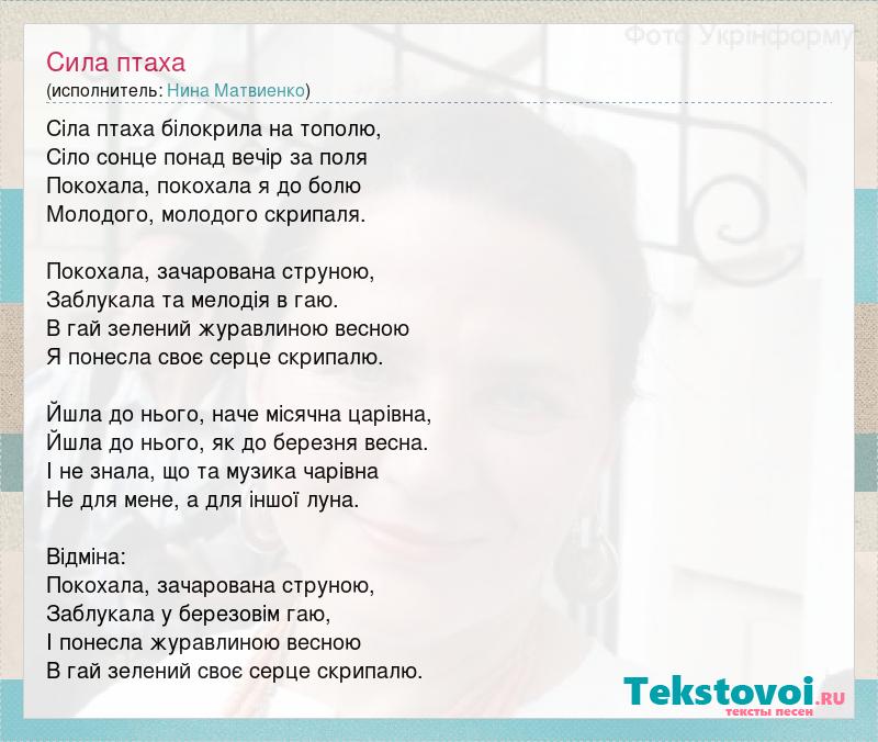 Сіла птаха білокрила на тополю, Сіло сонце понад вечір за поля Покохала, покохала я до болю Молодого, молодого скрипаля. Покохала, зачарована струною, Заблукала та мелодія в гаю. В гай зелений журавлиною весною Я понесла своє серце скрипалю. Йшла до нього, наче місячна царівна, Йшла до нього, як до березня весна. І не знала, що та музика чарівна Не для мене, а для іншої луна. Відміна: Покохала, зачарована струною, Заблукала у березовім гаю, І понесла журавлиною весною В гай зелений своє серце скрипалю.