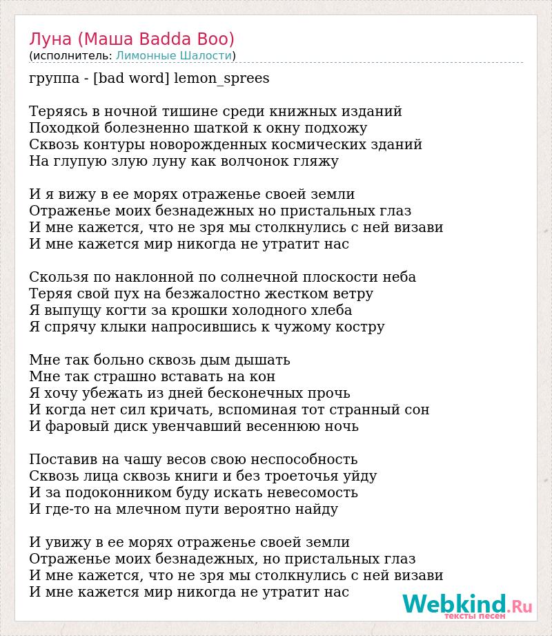группа - [bad word] lemon_sprees Теряясь в ночной тишине среди книжных изданий Походкой болезненно шаткой к окну подхожу Сквозь контуры новорожденных космических зданий На глупую злую луну как волчонок гляжу И я вижу в ее морях отраженье своей земли Отраженье моих безнадежных но пристальных глаз И мне кажется, что не зря мы столкнулись с ней визави И мне кажется мир никогда не утратит нас Скользя по наклонной по солнечной плоскости неба Теряя свой пух на безжалостно жестком ветру Я выпущу когти за крошки холодного хлеба Я спрячу клыки напросившись к чужому костру Мне так больно сквозь дым дышать Мне так страшно вставать на кон Я хочу убежать из дней бесконечных прочь И когда нет сил кричать, вспоминая тот странный сон И фаровый диск увенчавший весеннюю ночь Поставив на чашу весов свою неспособность Сквозь лица сквозь книги и без троеточья уйду И за подоконником буду искать невесомость И где-то на млечном пути вероятно найду И увижу в ее морях отраженье своей земли Отраженье моих безнадежных, но пристальных глаз И мне кажется, что не зря мы столкнулись с ней визави И мне кажется мир никогда не утратит нас