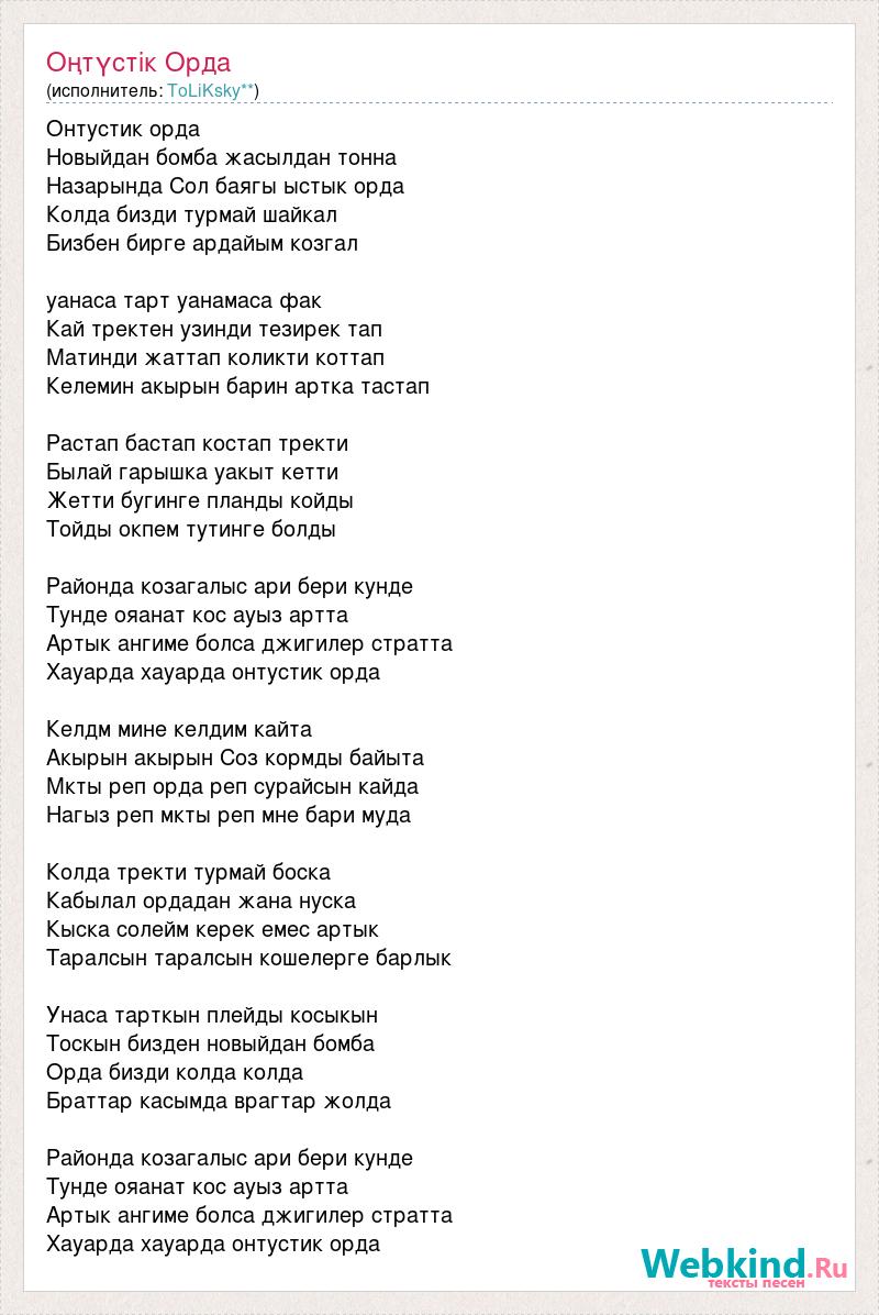 Онтустик орда Новыйдан бомба жасылдан тонна Назарында Сол баягы ыстык орда Колда бизди турмай шайкал Бизбен бирге ардайым козгал уанаса тарт уанамаса фак Кай тректен узинди тезирек тап Матинди жаттап коликти коттап Келемин акырын барин артка тастап Растап бастап костап тректи Былай гарышка уакыт кетти Жетти бугинге планды койды Тойды окпем тутинге болды Районда козагалыс ари бери кунде Тунде ояанат кос ауыз артта Артык ангиме болса джигилер стратта Хауарда хауарда онтустик орда Келдм мине келдим кайта Акырын акырын Соз кормды байыта Мкты реп орда реп сурайсын кайда Нагыз реп мкты реп мне бари муда Колда тректи турмай боска Кабылал ордадан жана нуска Кыска солейм керек емес артык Таралсын таралсын кошелерге барлык Унаса тарткын плейды косыкын Тоскын бизден новыйдан бомба Орда бизди колда колда Браттар касымда врагтар жолда Районда козагалыс ари бери кунде Тунде ояанат кос ауыз артта Артык ангиме болса джигилер стратта Хауарда хауарда онтустик орда