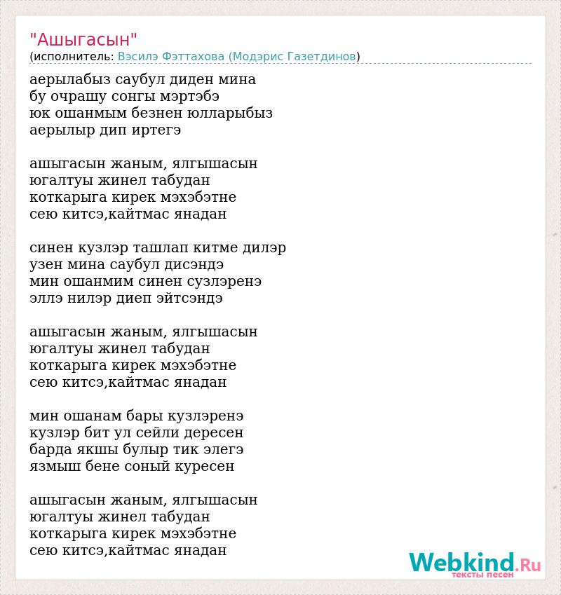 аерылабыз саубул диден мина бу очрашу сонгы мэртэбэ юк ошанмым безнен юлларыбыз аерылыр дип иртегэ ашыгасын жаным, ялгышасын югалтуы жинел табудан коткарыга кирек мэхэбэтне сею китсэ,кайтмас янадан синен кузлэр ташлап китме дилэр узен мина саубул дисэндэ мин ошанмим синен сузлэренэ эллэ нилэр диеп эйтсэндэ ашыгасын жаным, ялгышасын югалтуы жинел табудан коткарыга кирек мэхэбэтне сею китсэ,кайтмас янадан мин ошанам бары кузлэренэ кузлэр бит ул сейли дересен барда якшы булыр тик элегэ язмыш бене соный куресен ашыгасын жаным, ялгышасын югалтуы жинел табудан коткарыга кирек мэхэбэтне сею китсэ,кайтмас янадан