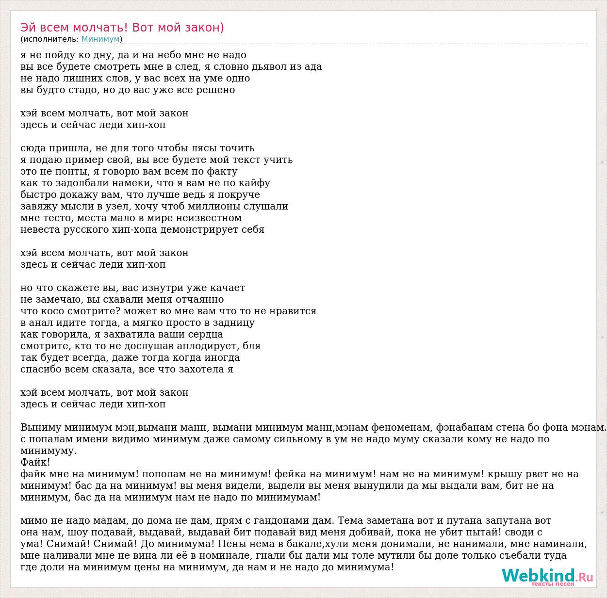 я не пойду ко дну, да и на небо мне не надо вы все будете смотреть мне в след, я словно дьявол из ада не надо лишних слов, у вас всех на уме одно вы будто стадо, но до вас уже все решено хэй всем молчать, вот мой закон здесь и сейчас леди хип-хоп сюда пришла, не для того чтобы лясы точить я подаю пример свой, вы все будете мой текст учить это не понты, я говорю вам всем по факту как то задолбали намеки, что я вам не по кайфу быстро докажу вам, что лучше ведь я покруче завяжу мысли в узел, хочу чтоб миллионы слушали мне тесто, места мало в мире неизвестном невеста русского хип-хопа демонстрирует себя хэй всем молчать, вот мой закон здесь и сейчас леди хип-хоп но что скажете вы, вас изнутри уже качает не замечаю, вы схавали меня отчаянно что косо смотрите? может во мне вам что то не нравится в анал идите тогда, а мягко просто в задницу как говорила, я захватила ваши сердца смотрите, кто то не дослушав аплодирует, бля так будет всегда, даже тогда когда иногда спасибо всем сказала, все что захотела я хэй всем молчать, вот мой закон здесь и сейчас леди хип-хоп Выниму минимум мэн,вымани манн, вымани минимум манн,мэнам феноменам, фэнабанам стена бо фона мэнам. с попалам имени видимо минимум даже самому сильному в ум не надо муму сказали кому не надо по минимуму. Файк! файк мне на минимум! пополам не на минимум! фейка на минимум! нам не на минимум! крышу рвет не на минимум! бас да на минимум! вы меня видели, выдели вы меня вынудили да мы выдали вам, бит не на минимум, бас да на минимум нам не надо по минимумам! мимо не надо мадам, до дома не дам, прям с гандонами дам. Тема заметана вот и путана запутана вот она нам, шоу подавай, выдавай, выдавай бит подавай вид меня добивай, пока не убит пытай! своди с ума! Снимай! Снимай! До минимума! Пены нема в бакале,хули меня донимали, не нанимали, мне наминали, мне наливали мне не вина ли её в номинале, гнали бы дали мы толе мутили бы доле только съебали туда где доли на минимум цены на минимум, да нам и не надо до минимума!