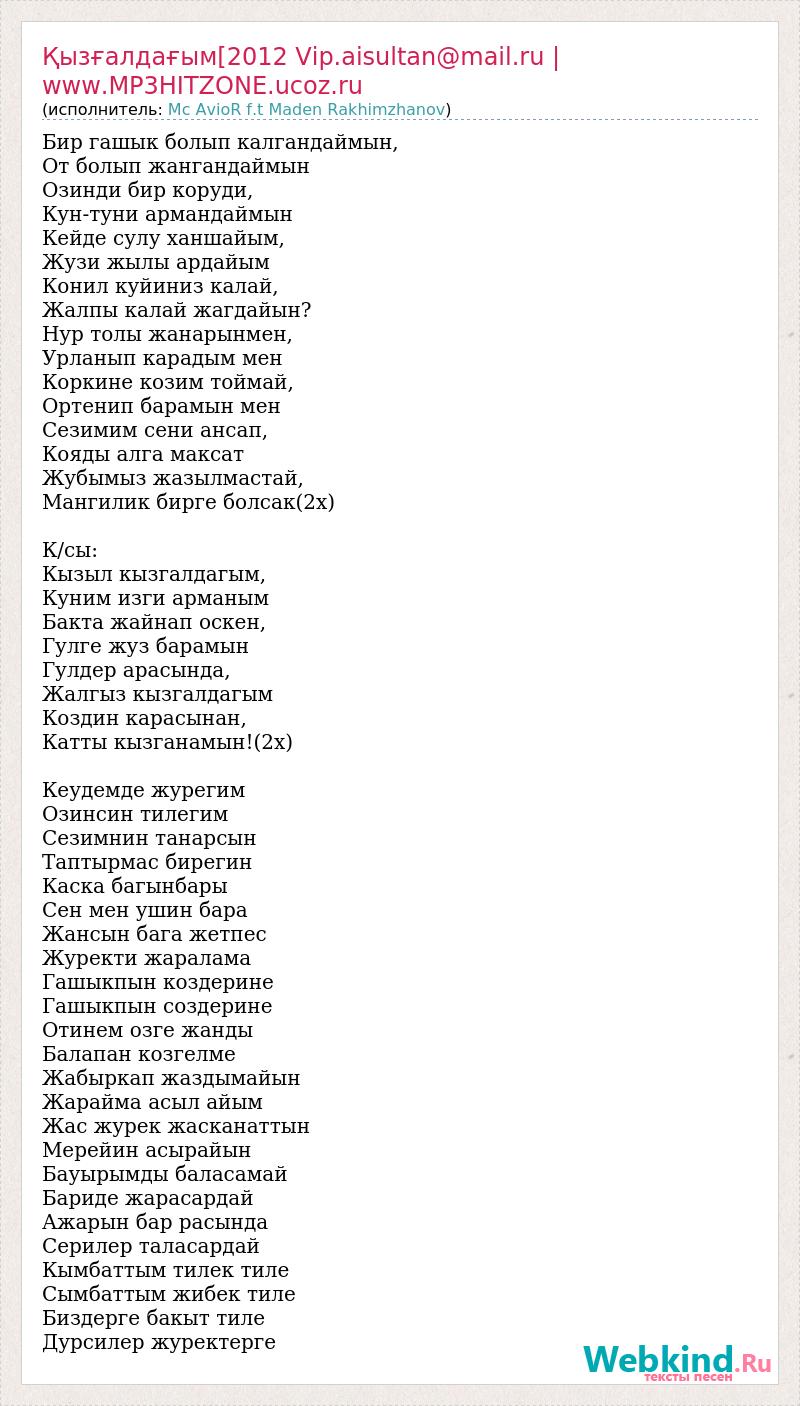 Бир гашык болып калгандаймын, От болып жангандаймын Озинди бир коруди, Кун-туни армандаймын Кейде сулу ханшайым, Жузи жылы ардайым Конил куйиниз калай, Жалпы калай жагдайын? Нур толы жанарынмен, Урланып карадым мен Коркине козим тоймай, Ортенип барамын мен Сезимим сени ансап, Кояды алга максат Жубымыз жазылмастай, Мангилик бирге болсак(2х) К/сы: Кызыл кызгалдагым, Куним изги арманым Бакта жайнап оскен, Гулге жуз барамын Гулдер арасында, Жалгыз кызгалдагым Коздин карасынан, Катты кызганамын!(2х) Кеудемде журегим Озинсин тилегим Сезимнин танарсын Таптырмас бирегин Каска багынбары Сен мен ушин бара Жансын бага жетпес Журекти жаралама Гашыкпын коздерине Гашыкпын создерине Отинем озге жанды Балапан козгелме Жабыркап жаздымайын Жарайма асыл айым Жас журек жасканаттын Мерейин асырайын Бауырымды баласамай Бариде жарасардай Ажарын бар расында Серилер таласардай Кымбаттым тилек тиле Сымбаттым жибек тиле Биздерге бакыт тиле Дурсилер журектерге