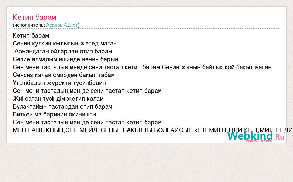 Кетип барам Сенин кулкин кылыгын жетед маган Армандаган ойлардан отип барам Сезие алмадым ишинде ненин барын Сен мени тастадын менде сени тастап кетип барам Сенин жанын байлык кой бакыт маган Сенсиз калай омирден бакыт табам Угынбадын журекти тусинбедин Сен мени тастадын,мен де сени тастап кетип барам Жиі саган тусіндім жетип калам Булактайын тастардан отип барам Биткеи ма баринин окиништи Сен мени тастадын мен де сени тастап кетип барам МЕН ГАШЫКПЫН,СЕН МЕЙЛІ СЕНБЕ БАКЫТТЫ БОЛГАЙСЫН.кЕТЕМИН ЕНДИ.КЕТЕМИН ЕНДИ