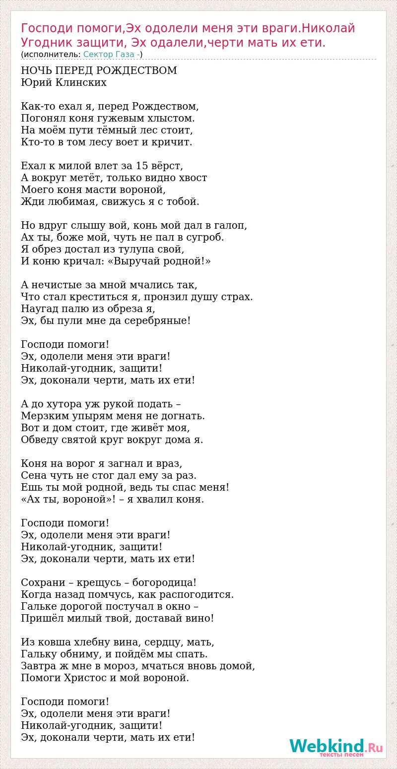 Господи помоги,Эх одолели меня эти враги.Николай Угодник защити, Эх одалели,черт