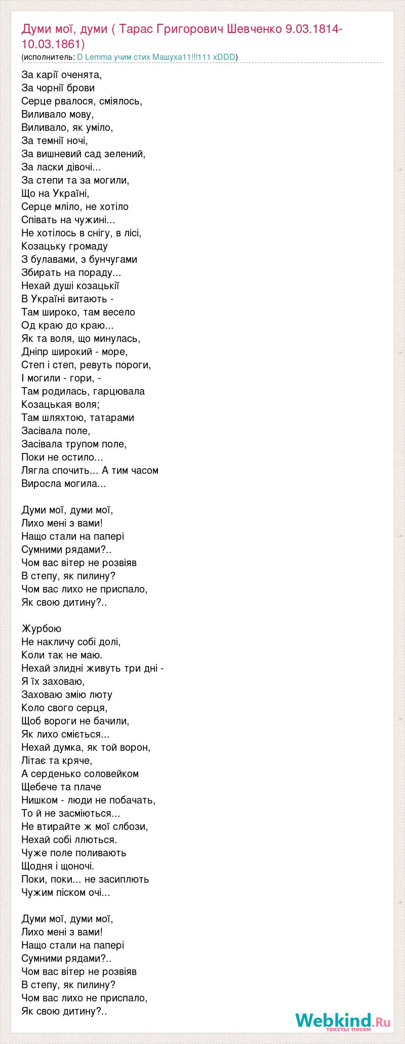 Главная→Исполнители→D Lemma учим стих Машуха11!!!111 хDDD→Думи мої, думи ( Тарас Григорович Шевченко 9.03.1814-10.03.1861)